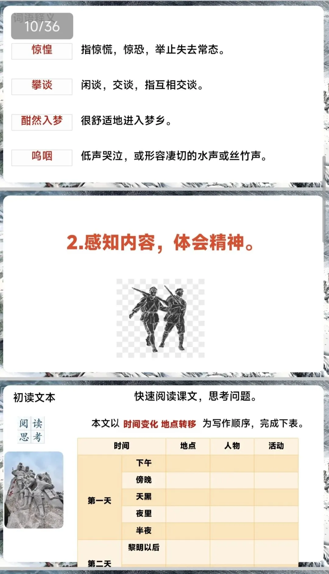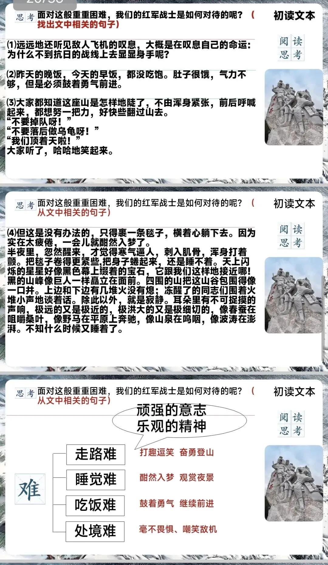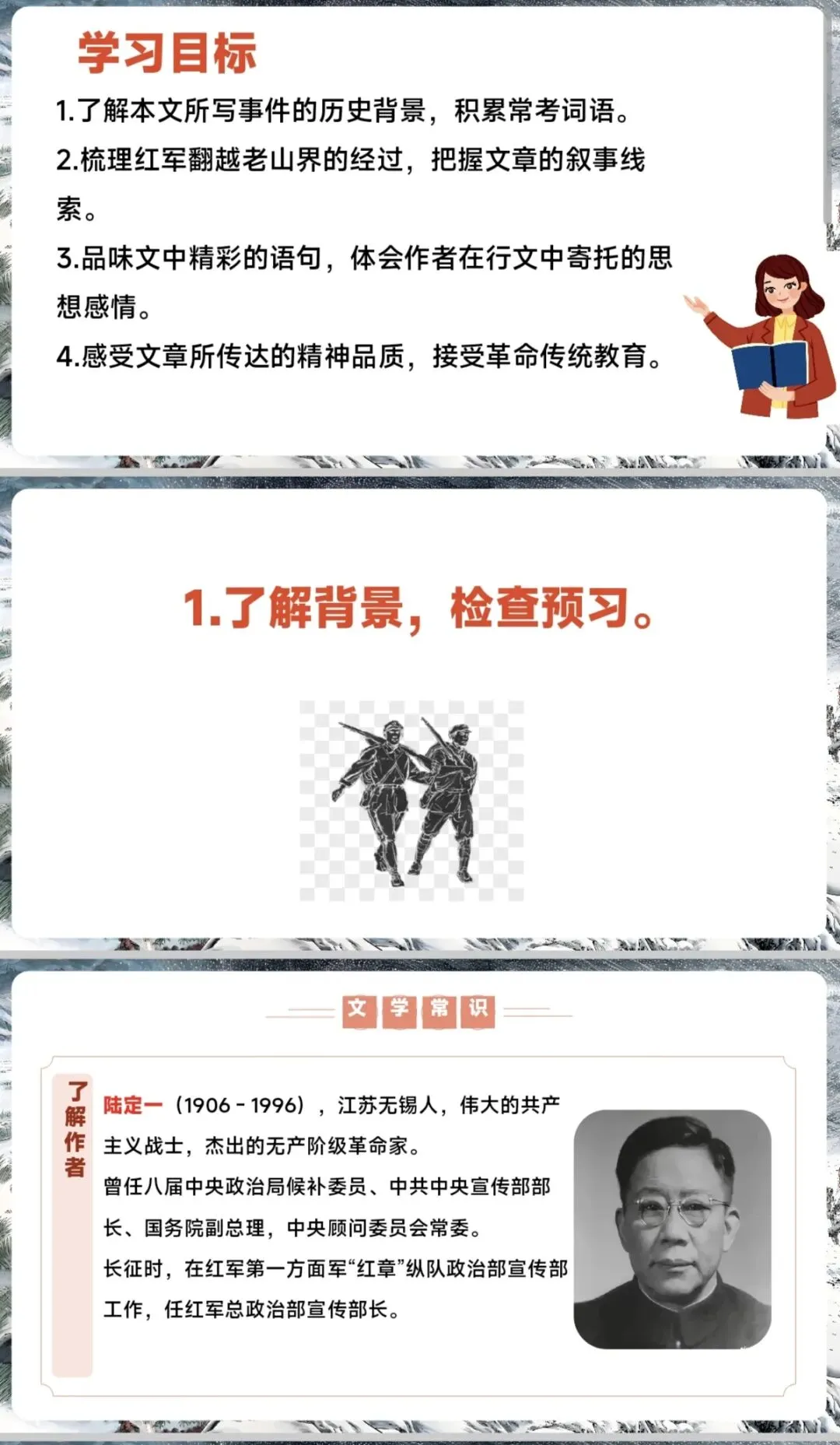 课件紧扣教材要求,从文学常识、创作背景入手,梳理红军翻山时间线与地点转移,清晰拆解走路、睡觉、吃饭、处境四重困难,深挖红军乐观坚毅的精神内核。