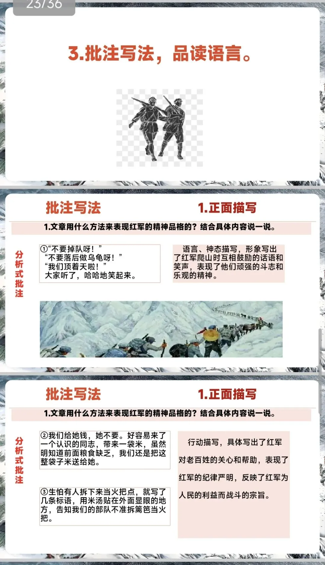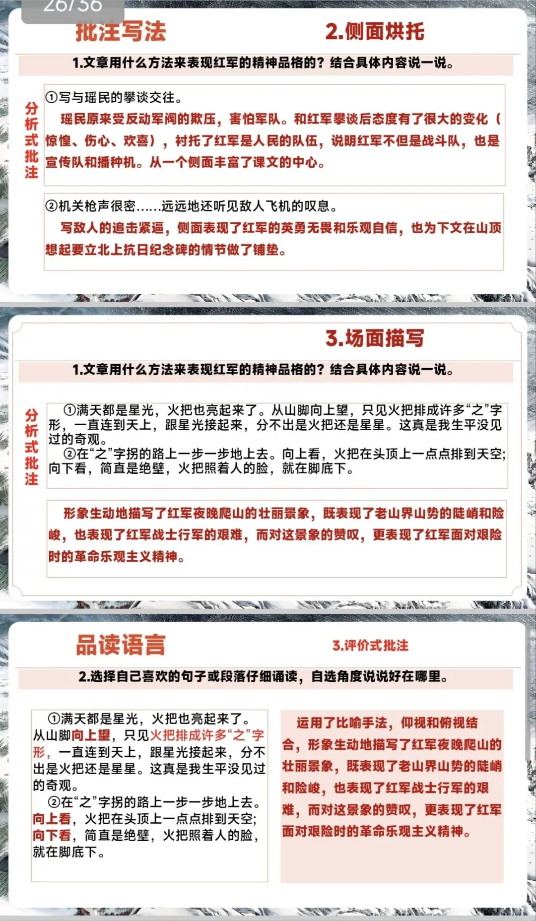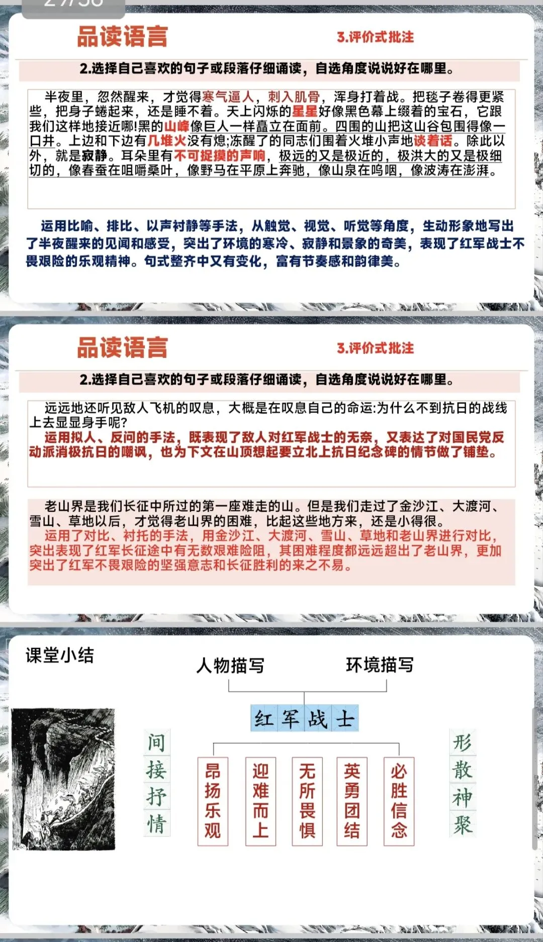 同时详解正面描写、侧面烘托、场面描写等写作手法,搭配词句品读、批注示例,还有长征精神提炼与时代思考,层层递进突破教学重难点。