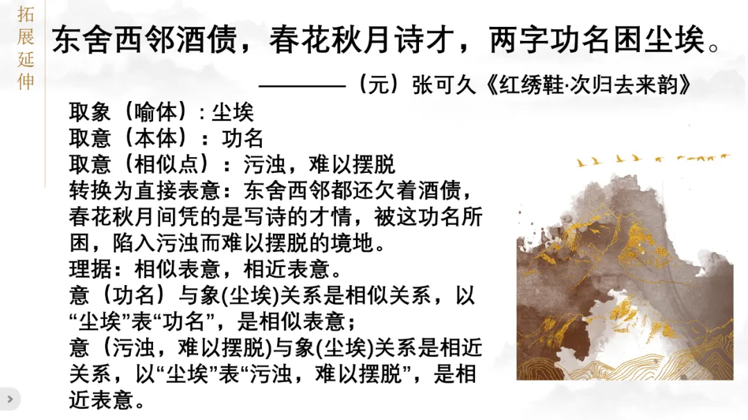以下是“意象分析4.0”模式(区分借代意象、比喻意象、因果意象、对比意象、双关意象)