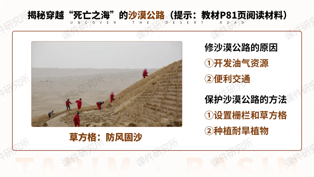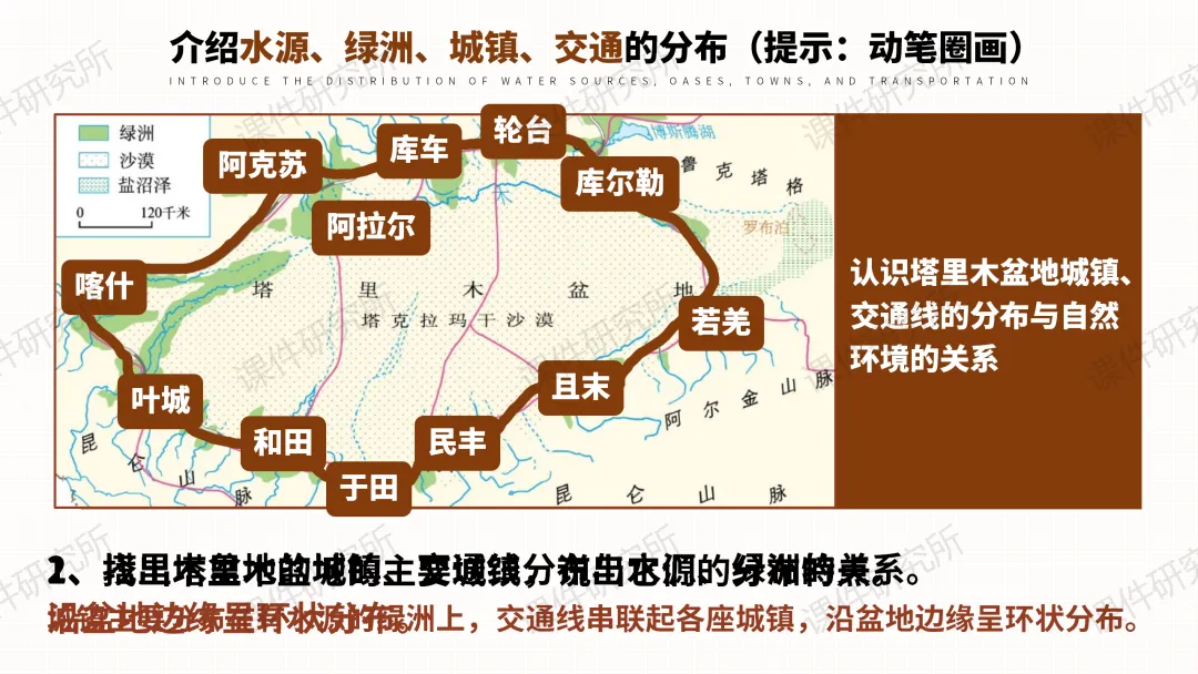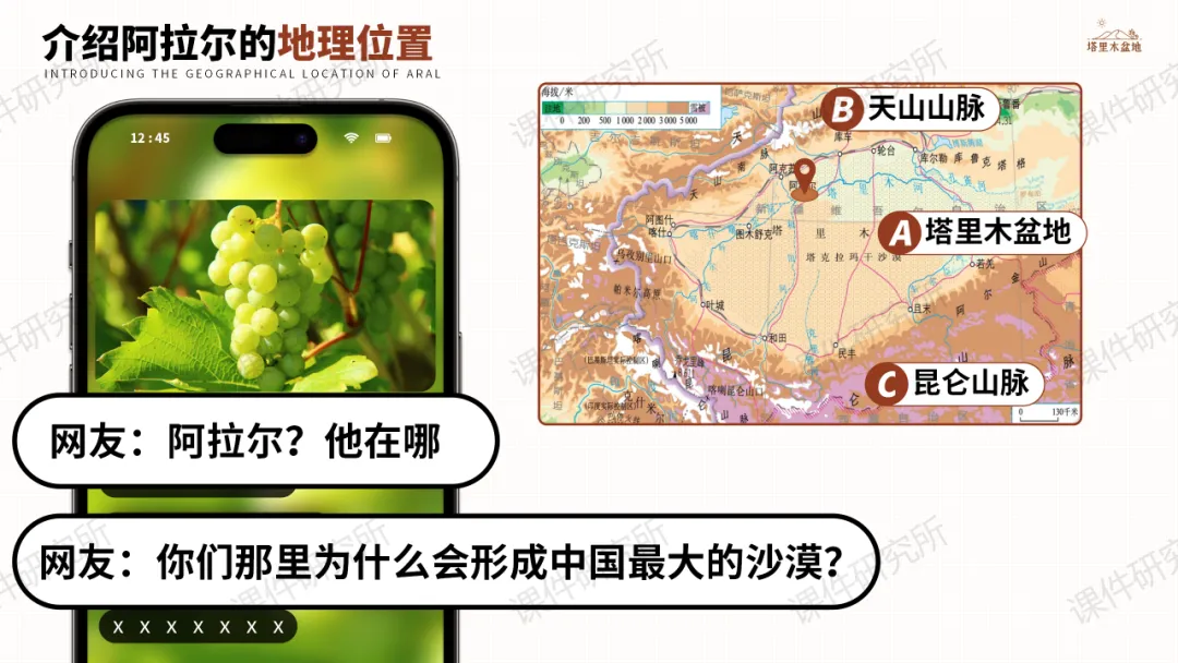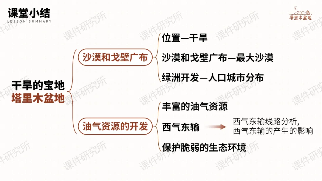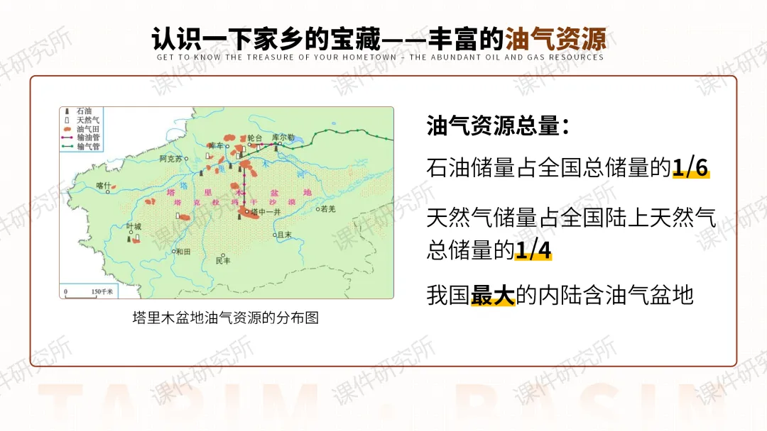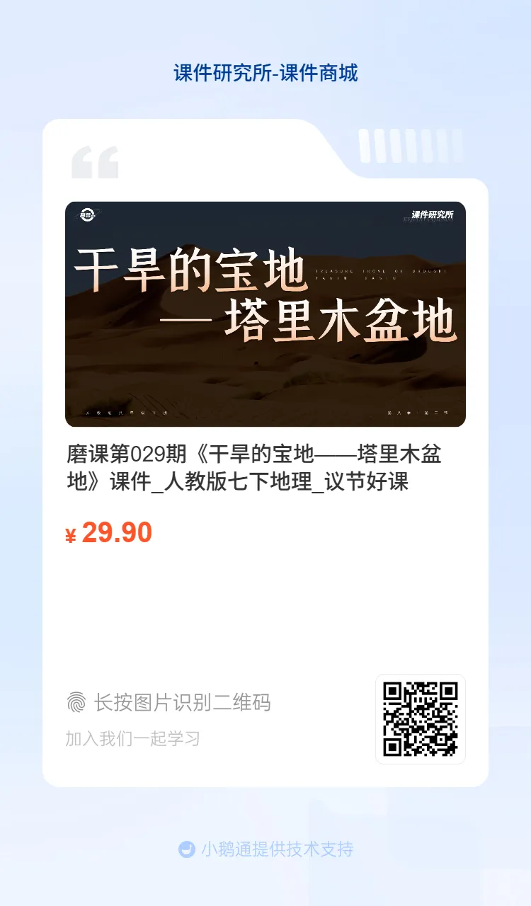 今天分享八下地理《干旱的宝地——塔里木盆地》公开课课件。本课件以 “直播家乡阿拉尔” 为情境主线,围绕塔里木盆地设网友提问,串联位置、沙漠成因、绿洲与城镇分布等知识点;结合教材解读沙漠公路、油气资源及西气东输工程,分析工程东西部效益;强调生态保护,配课堂练习巩固,最后以家乡代言稿为作业,融知识讲解与乡土情怀,贴合八年级学生认知。
