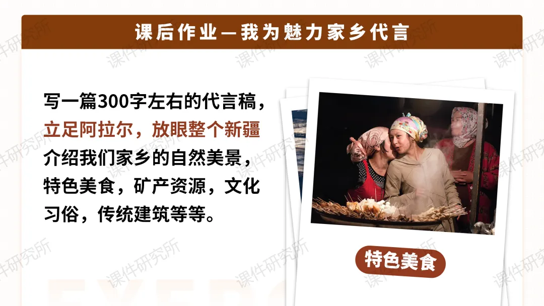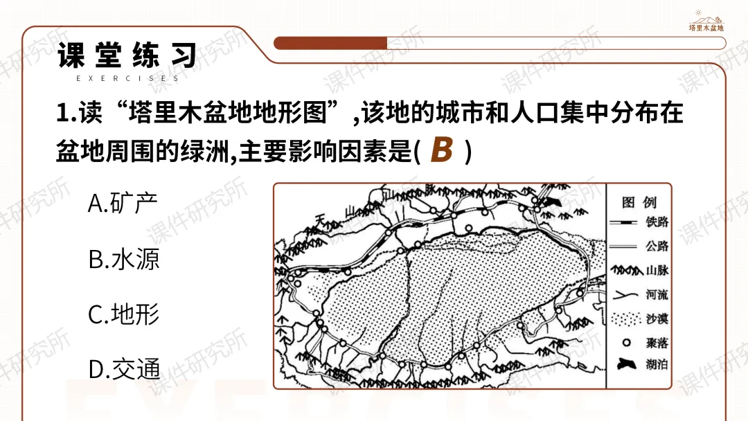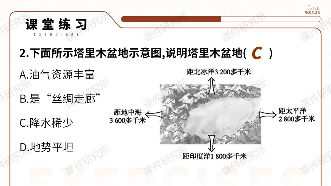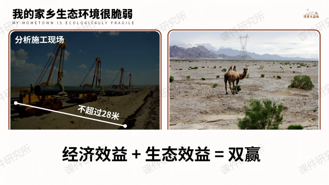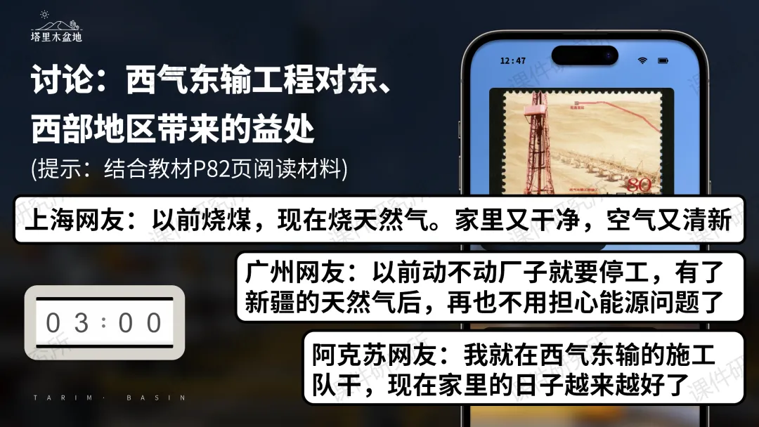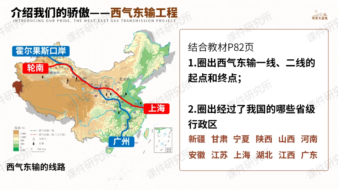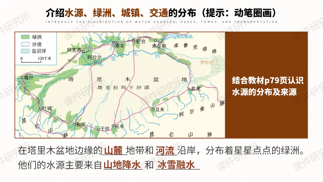 今天分享八下地理《干旱的宝地——塔里木盆地》公开课课件。本课件以 “直播家乡阿拉尔” 为情境主线,围绕塔里木盆地设网友提问,串联位置、沙漠成因、绿洲与城镇分布等知识点;结合教材解读沙漠公路、油气资源及西气东输工程,分析工程东西部效益;强调生态保护,配课堂练习巩固,最后以家乡代言稿为作业,融知识讲解与乡土情怀,贴合八年级学生认知。