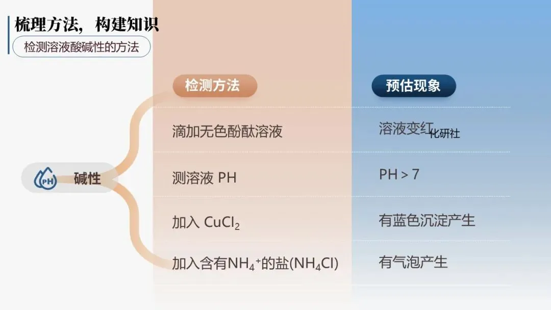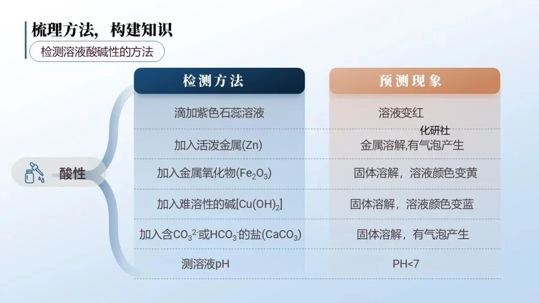 - 教师小结:“大家总结的方法既包括指示剂法、pH 试纸法,也用到了酸和碱的化学性质,比如酸与活泼金属、金属氧化物的反应,碱与盐的反应,这正是我们复习的重点!”