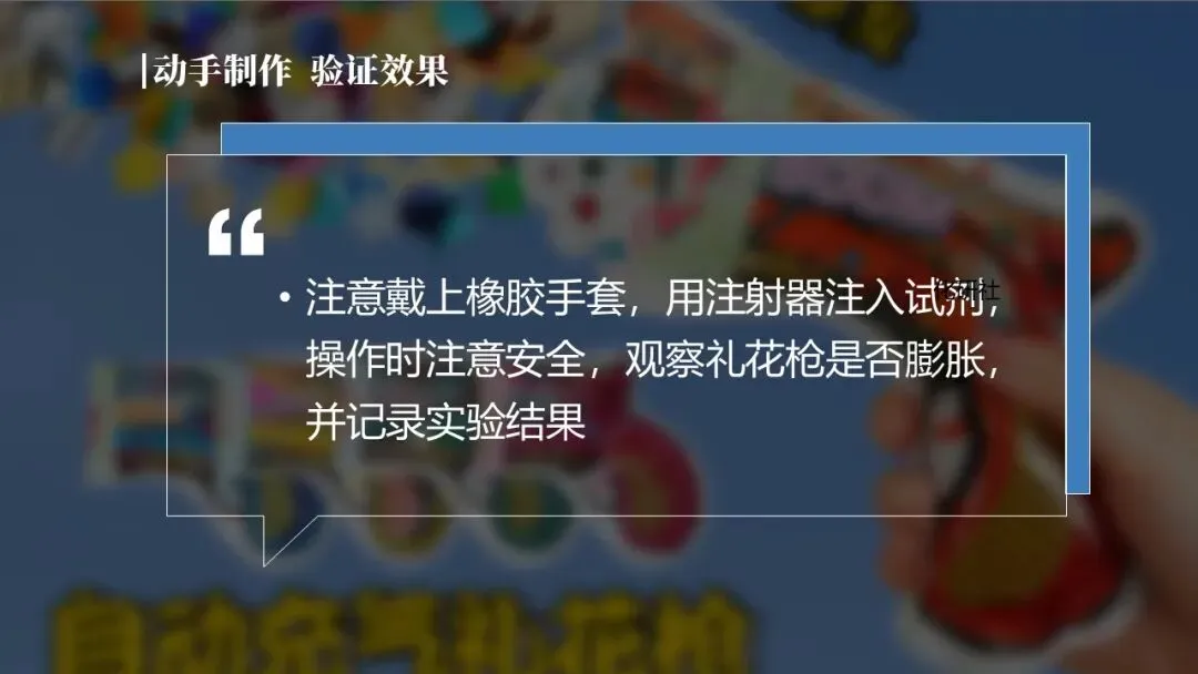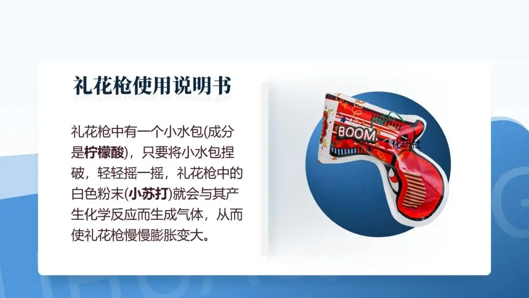 - 学生活动:分组拆解礼花枪,发现内部有 “小水包” 和 “白色粉末” 两种物质。