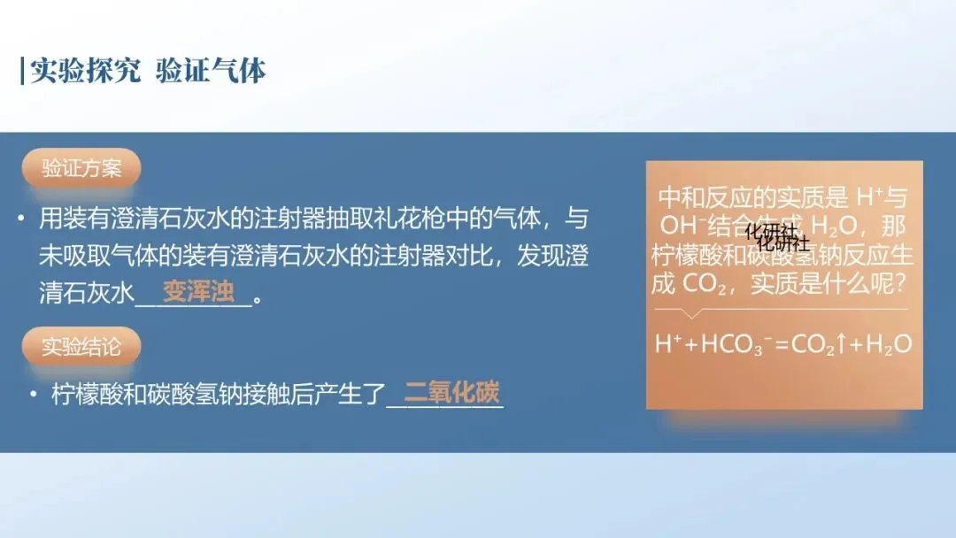 - 过渡语:“通过实验我们确定了两种物质的酸碱性,那它们具体是什么呢?这就需要进入第二个项目,探究礼花枪的反应原理。”