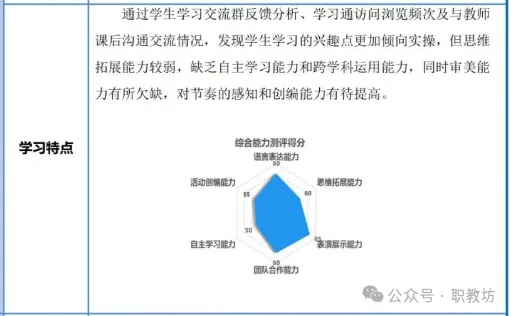 突出学生“最近发展区”,如“70%学生对实验操作流程不熟悉,需强化可视化演示”。