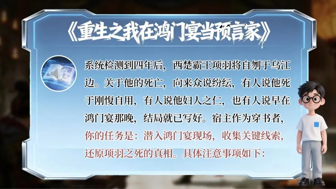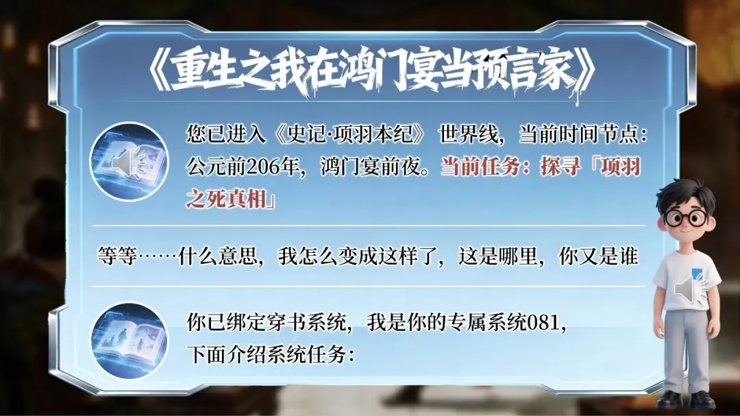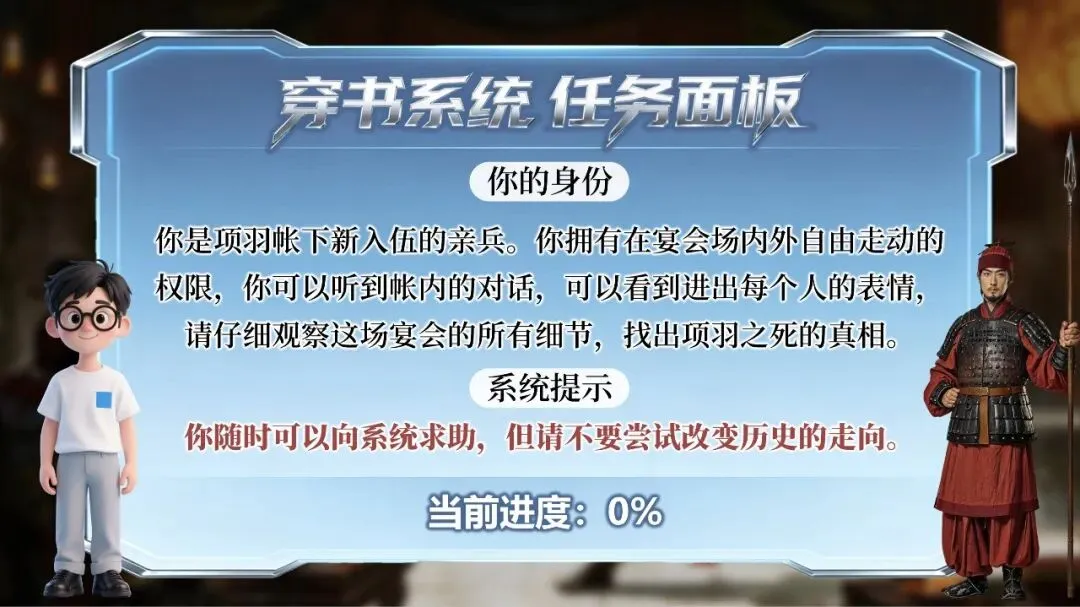 “你现在已经穿越进《史记·项羽本纪》的世界。时间:公元前206年,鸿门宴前夜。身份:项羽帐下的一名亲兵。任务只有一个——查清楚四年后乌江自刎的真相。”