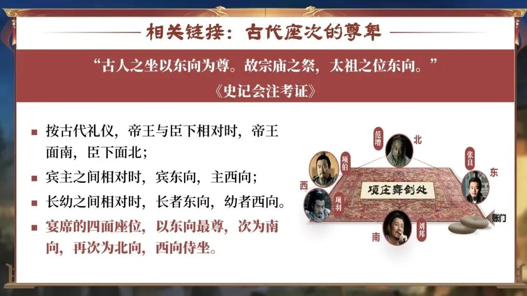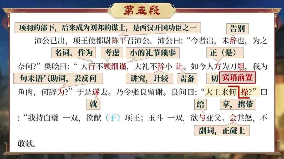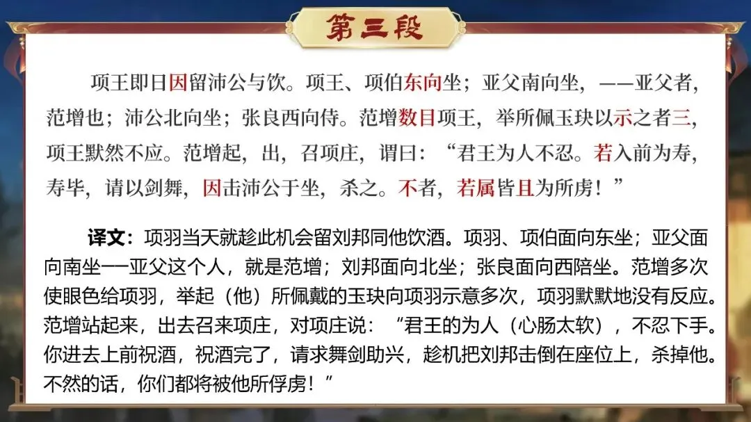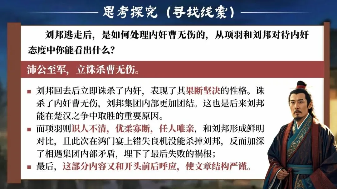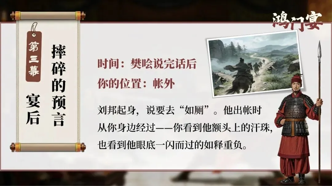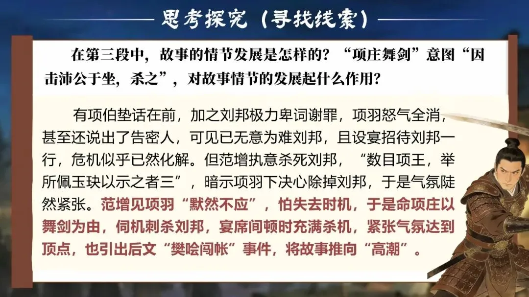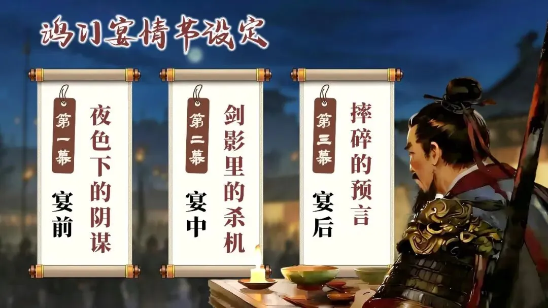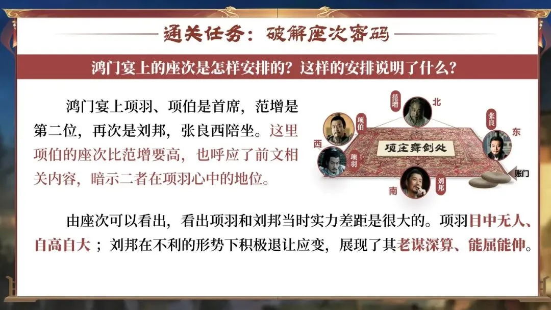 他们需要在宴前、宴中、宴后的每一个细节里寻找线索:曹无伤的告密、范增的玉玦、项庄的舞剑、樊哙的闯帐……