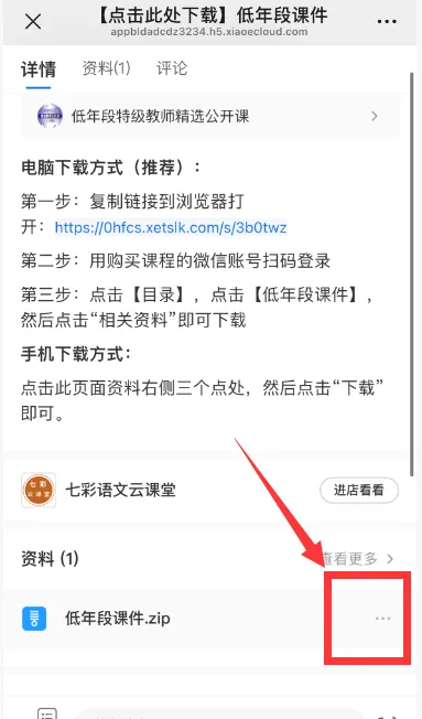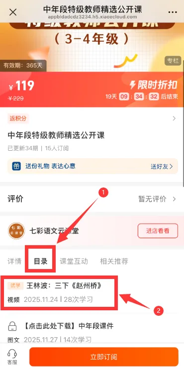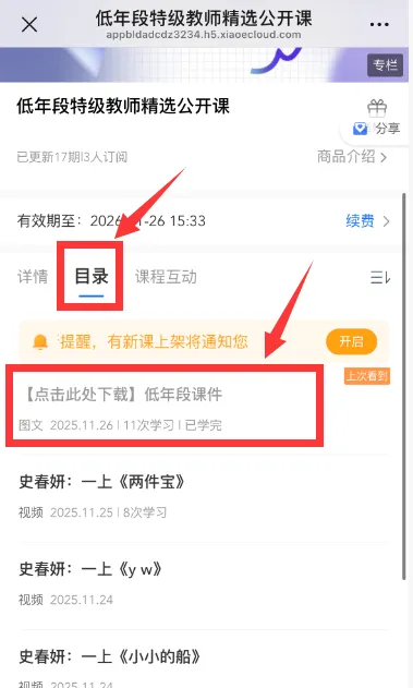 第一步:进入课程页面,点击“目录”,点击“低年段课件”;