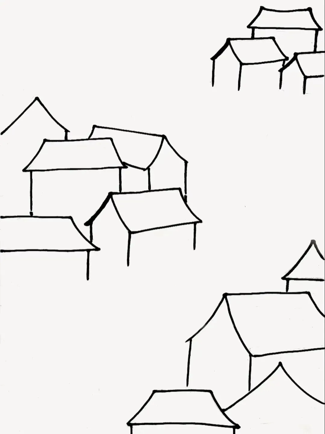 用铅笔轻轻画出错落的房屋轮廓(几何形组合),注意高低遮挡。