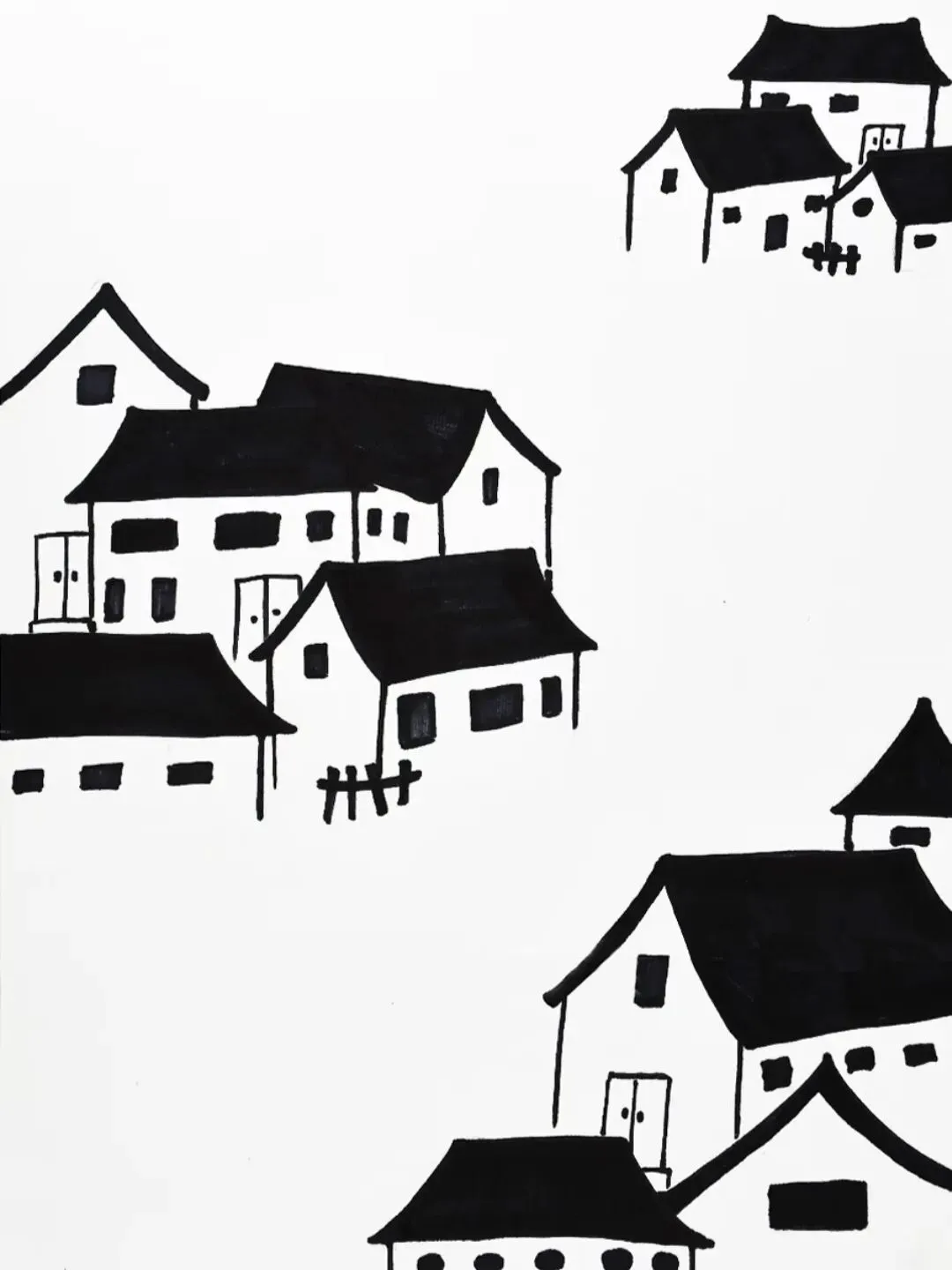 1. 用几何线条和黑白色块概括江南民居“白墙黑瓦”的素雅特征。