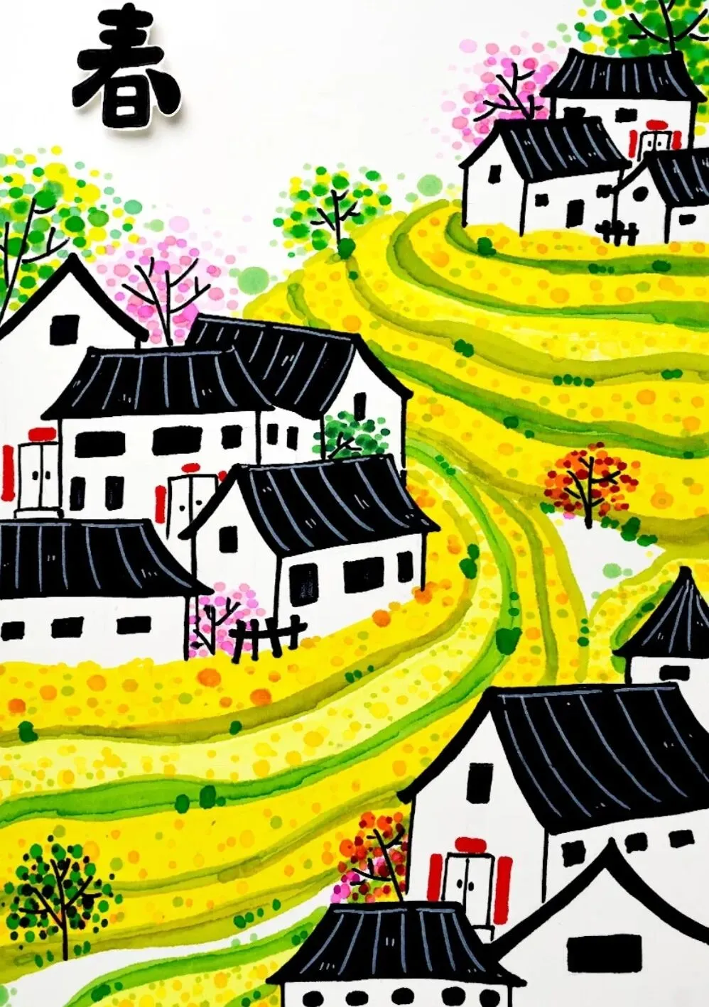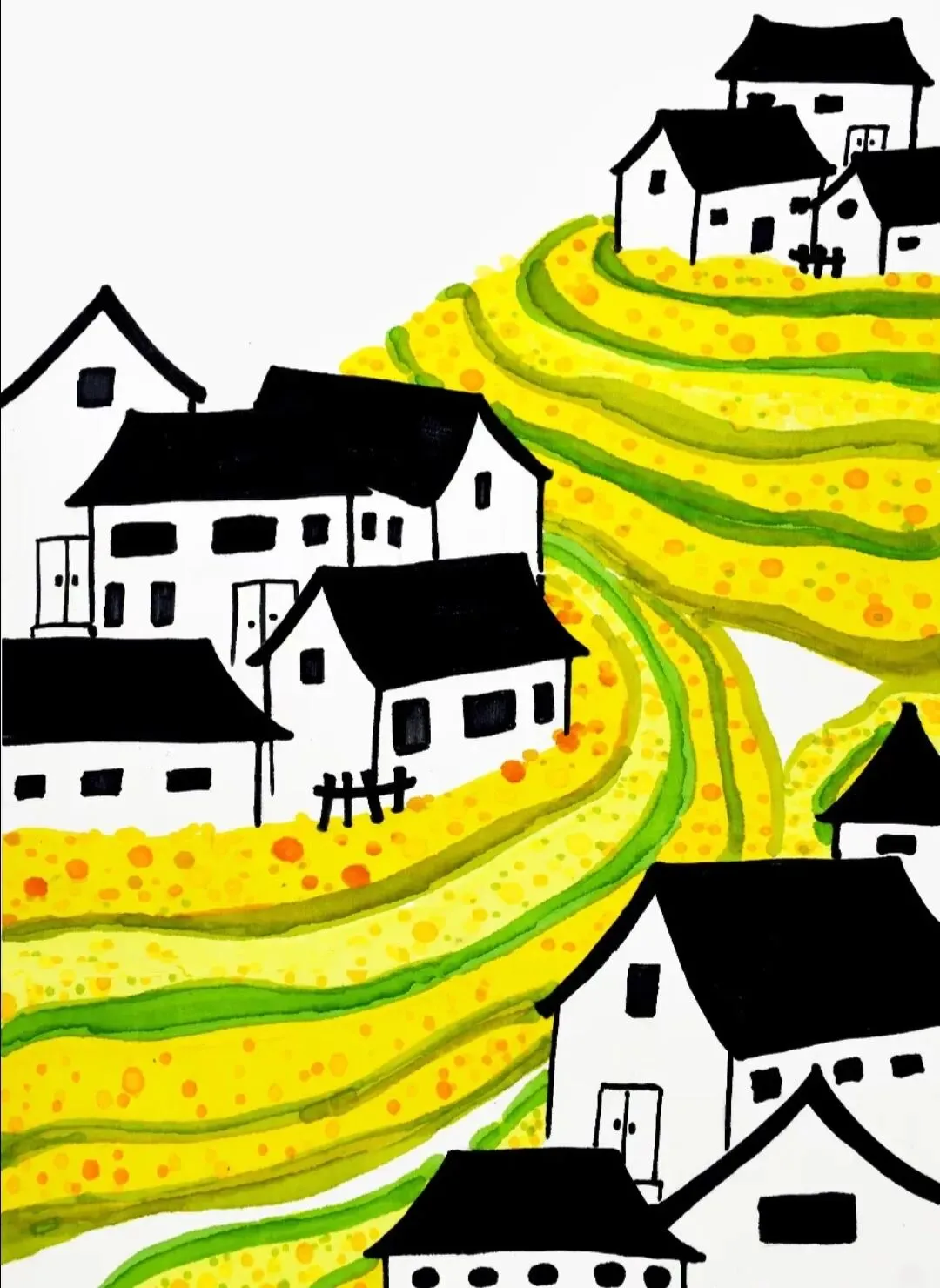 3. 教师总结:肯定学生对“白墙黑瓦”与油菜花海的表现,表扬有创意的细节点缀。