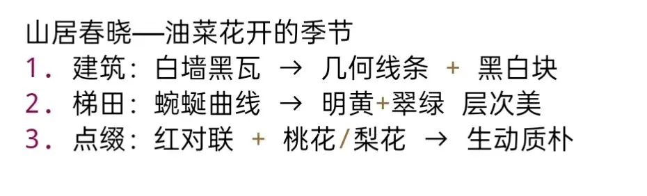 2. 引出课题:《山居春晓——油菜花开的季节》,引导学生感受“白墙黑瓦”与金色花海的视觉碰撞。