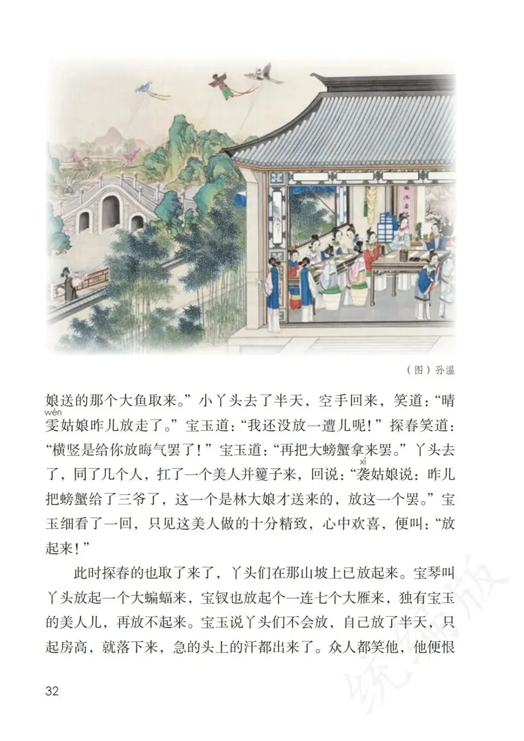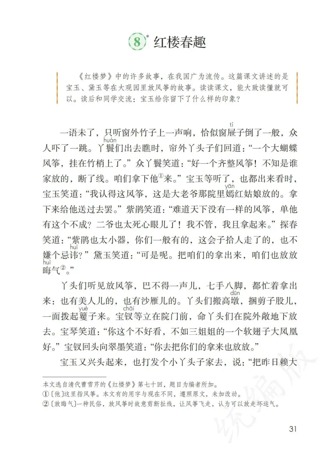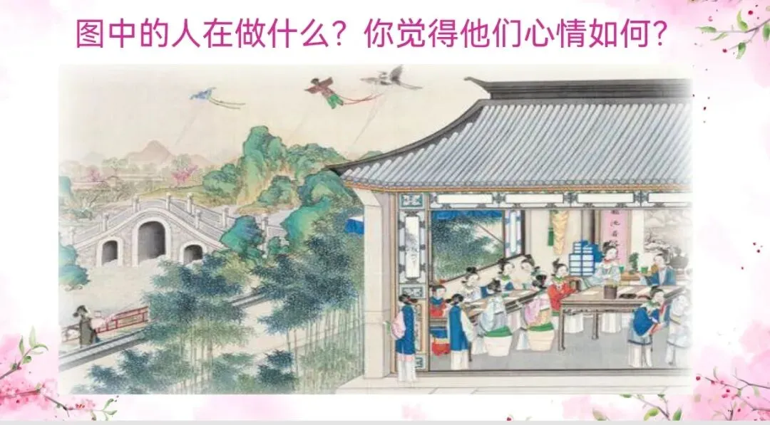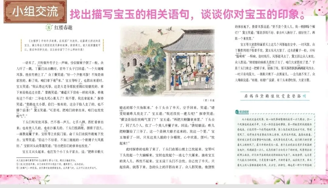 《红楼春趣》选自清代长篇小说《红楼梦》第70回,讲的是宝玉和黛玉等人一起在大观园里放风筝的故事。整篇文章按照事情发展的顺序,写了众人因拾到大老爷院里嫣红姑娘放的大蝴蝶风筝,便也想着去放风筝(起因)。于是丫头们拿出了各种放风筝的工具,众人七手八脚开始放风筝(经过)。最后大家都把风筝放飞了(结果)。借“放风筝”这一话题激发兴趣,引入清代著名作家孙温的画作(课文插图),简介《红楼梦》第七十回的内容,引出课题。引导学生用“猜读”、“联系上下文”、“看注释”等方法理解难懂的词语的意思。抓住课题中的“趣”字,引导学生在读文中寻找乐趣所在,用“文中哪个人物给你留下深刻的印象?”来引导学生抓住文中对人物的描写,体会人物的性格特点。链接阅读林庚的散文《风筝》,引导学生进一步了解放风筝这一民俗活动。1.认识“屉“、“嫣”等10个生字。读准多音字“喇“。2.默读课文,能大致了解故事的内容,并能说出对宝玉的印象。【教学过程】