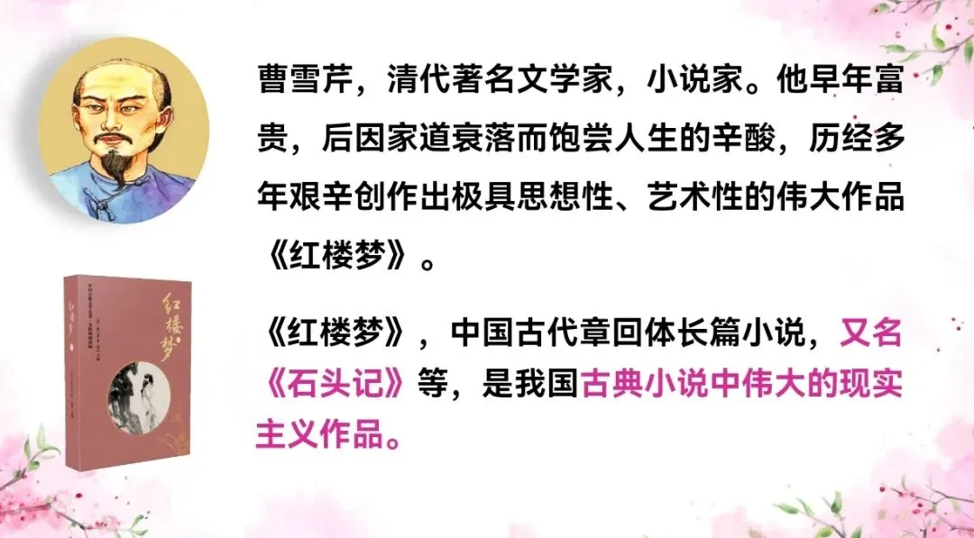 3.板书课题,认识作者,简介《红楼梦》及第七十回。