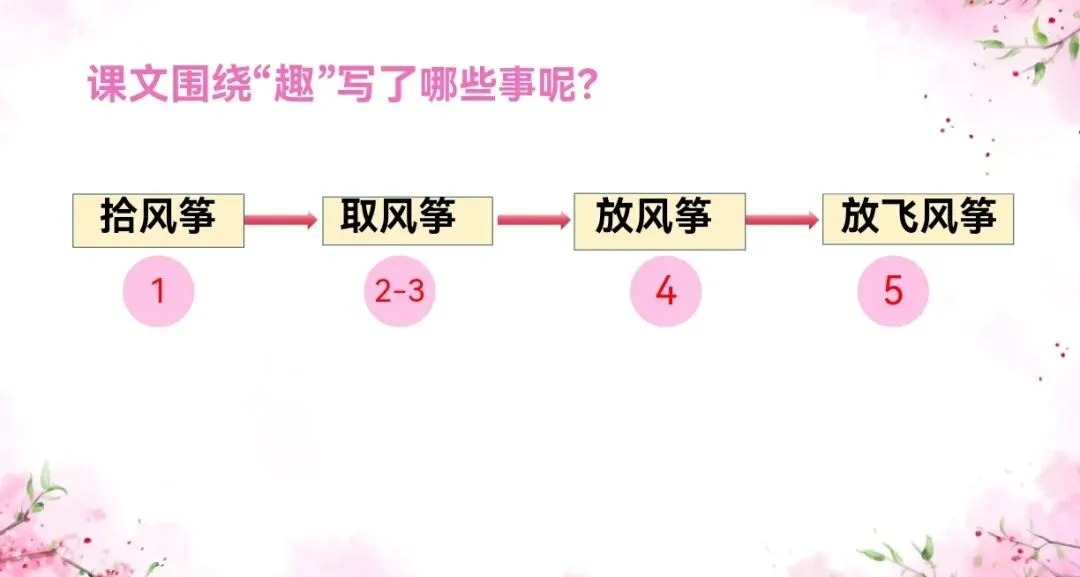 2.检查生字词语的掌握情况。完成情节填空:拾风筝→取风筝→放风筝→放飞风筝