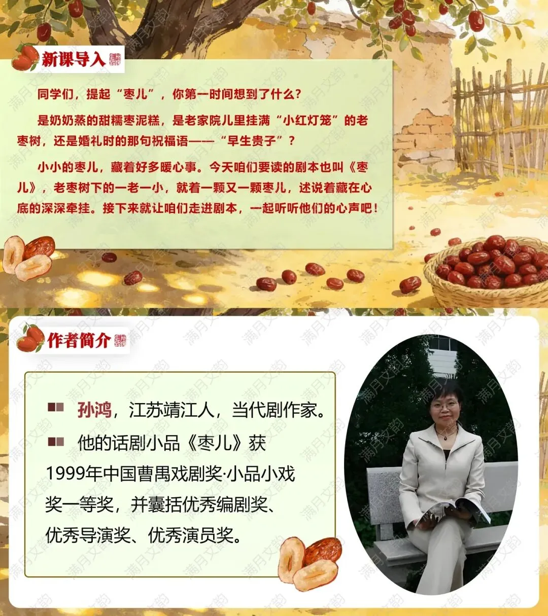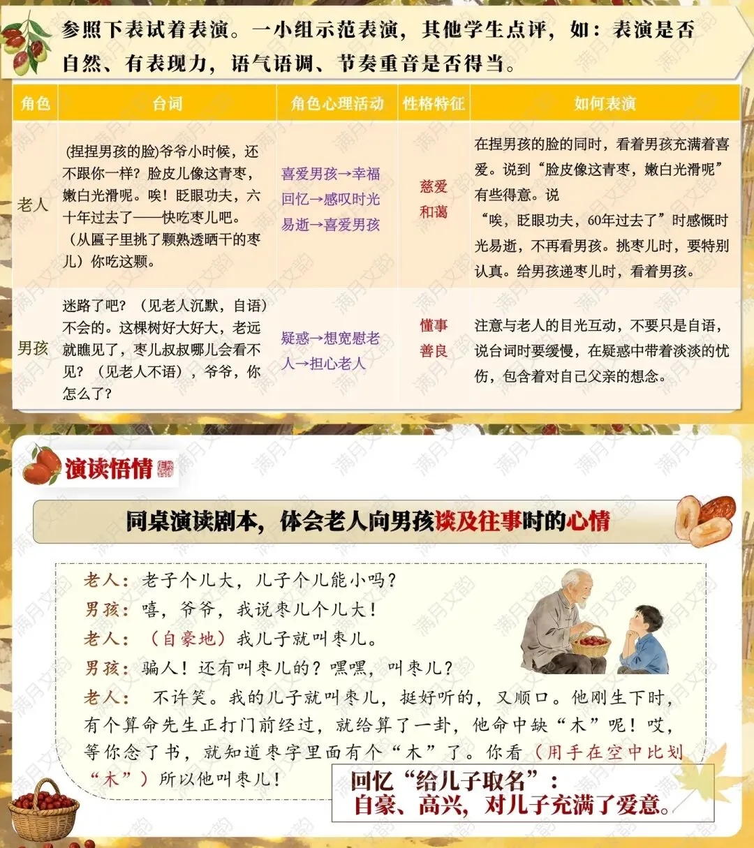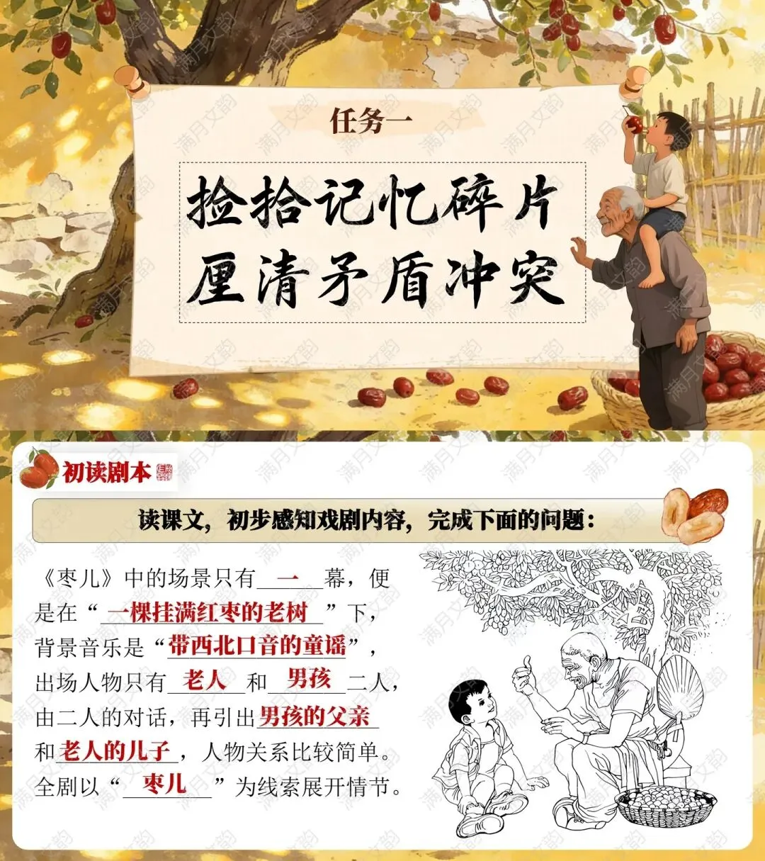 通过生活化提问激发兴趣:“同学们,提起‘枣儿’,你第一时间想到了什么?”学生分享后自然引出《枣儿》——老枣树下一老一小通过枣儿诉说牵挂与思念,快速进入情境