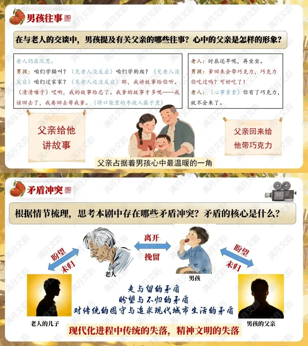 表层矛盾:老人与男孩(挽留与离开)、老人与儿子/男孩与父亲(期盼与未归)。