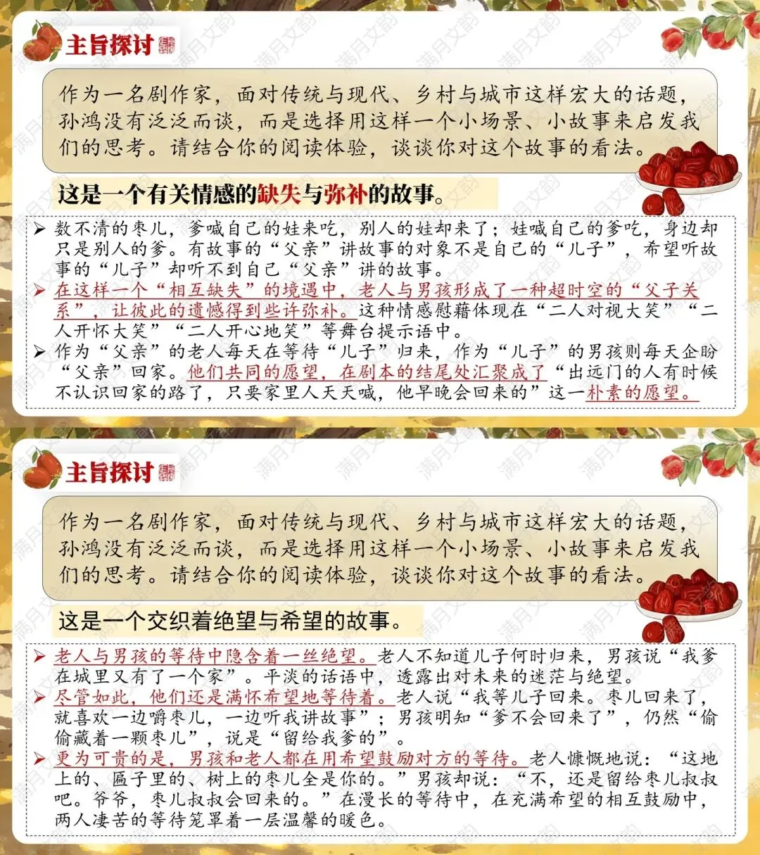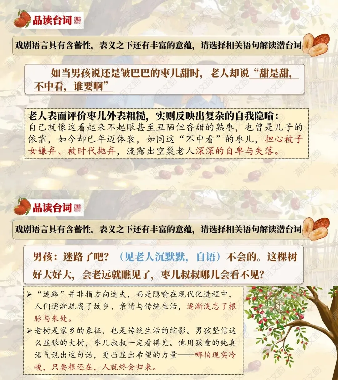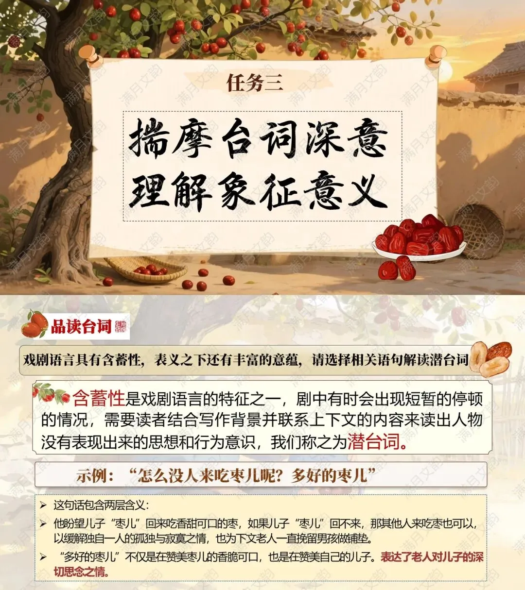 怎么没人来吃枣儿呢?多好的枣儿”——隐含老人对亲情的渴望,亦是对儿子的赞美。