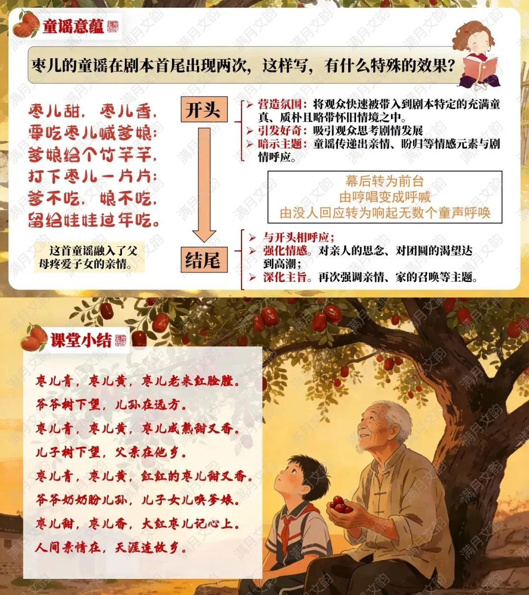 环节三:分析首尾呼应,童谣的作用:开头营造怀旧氛围,暗示主题;结尾强化亲情呼唤,深化“守望与回归”的期盼。