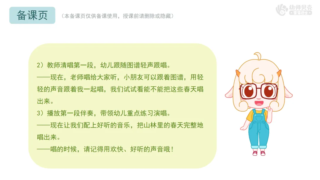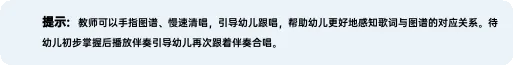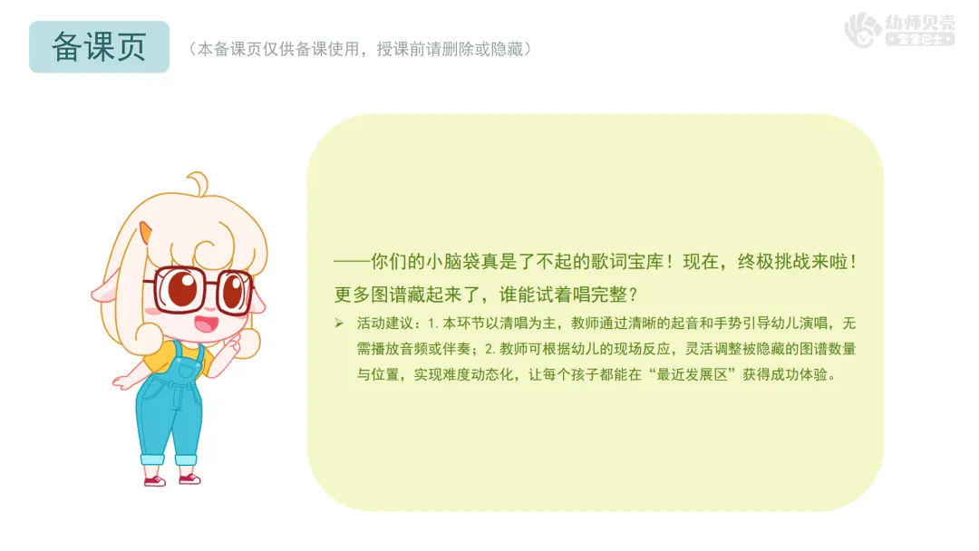 Ø活动建议:1.本环节以清唱为主,教师通过清晰的起音和手势引导幼儿演唱,无需播放音频或伴奏;2.教师可根据幼儿的现场反应,灵活调整被隐藏的图谱数量与位置,实现难度动态化,让每个孩子都能在“最近发展区”获得成功体验。