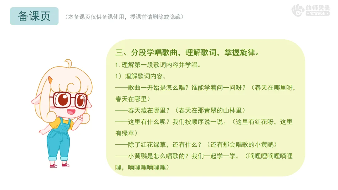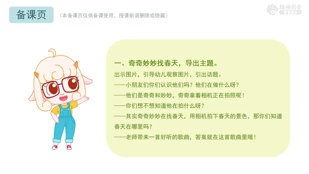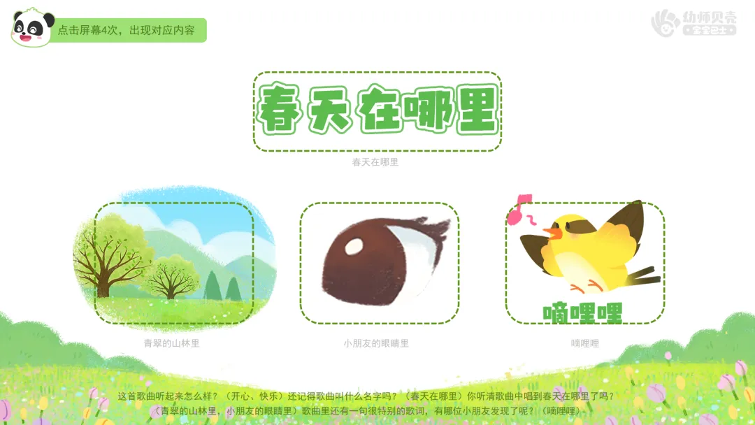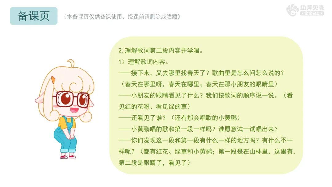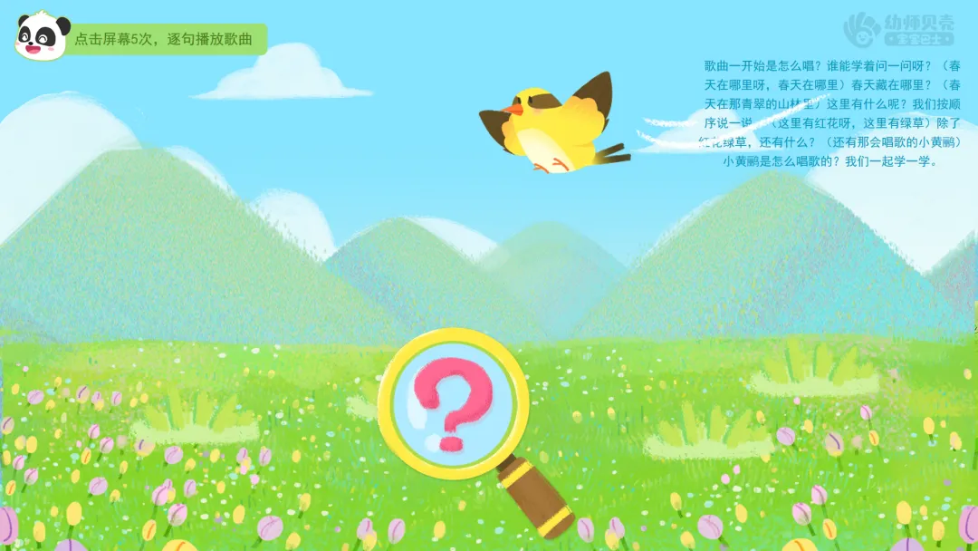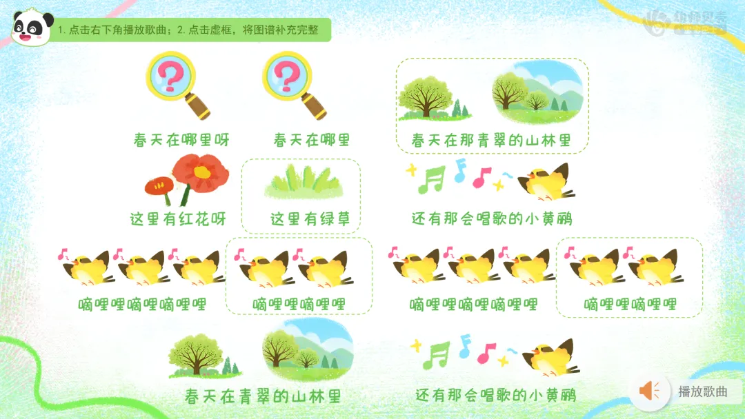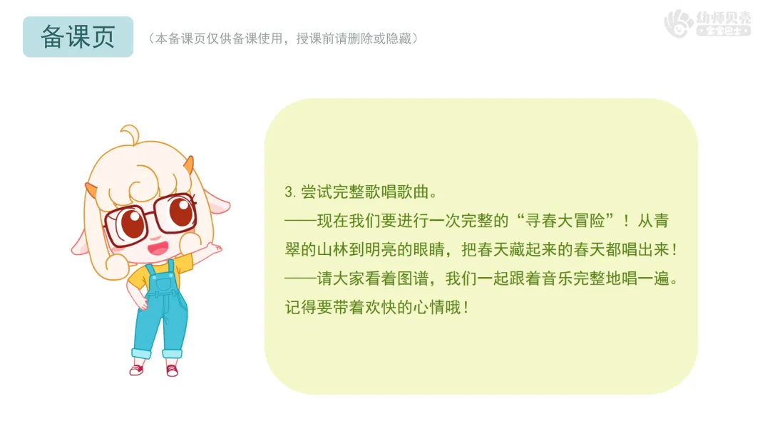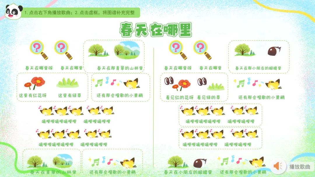 ——现在我们要进行一次完整的“寻春大冒险”!从青翠的山林到明亮的眼睛,把春天藏起来的春天都唱出来!