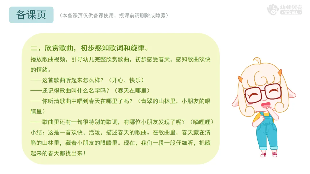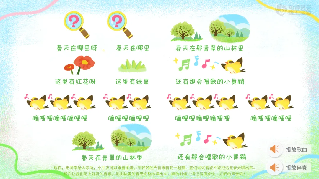小结:这是一首欢快、活泼,描述春天的歌曲。在歌曲里,春天藏在清脆的山林里,藏着小朋友的眼睛里。现在,我们一段一段仔细听,把藏起来的春天都找出来!