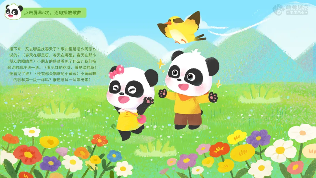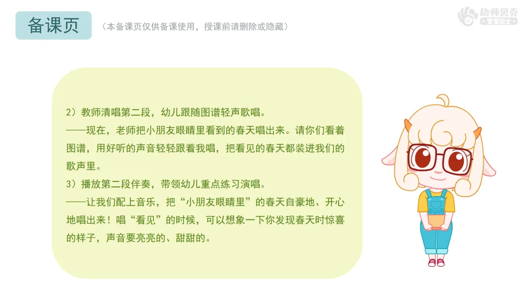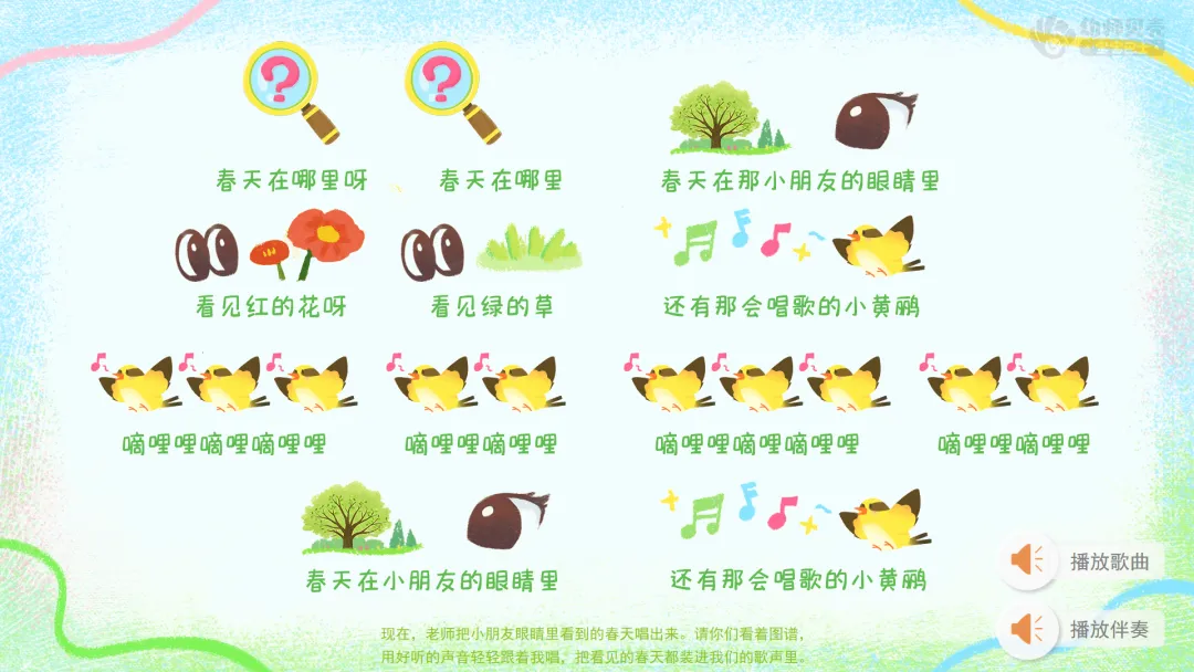 ——让我们配上音乐,把“小朋友眼睛里”的春天自豪地、开心地唱出来!唱“看见”的时候,可以想象一下你发现春天时惊喜的样子,声音要亮亮的、甜甜的。