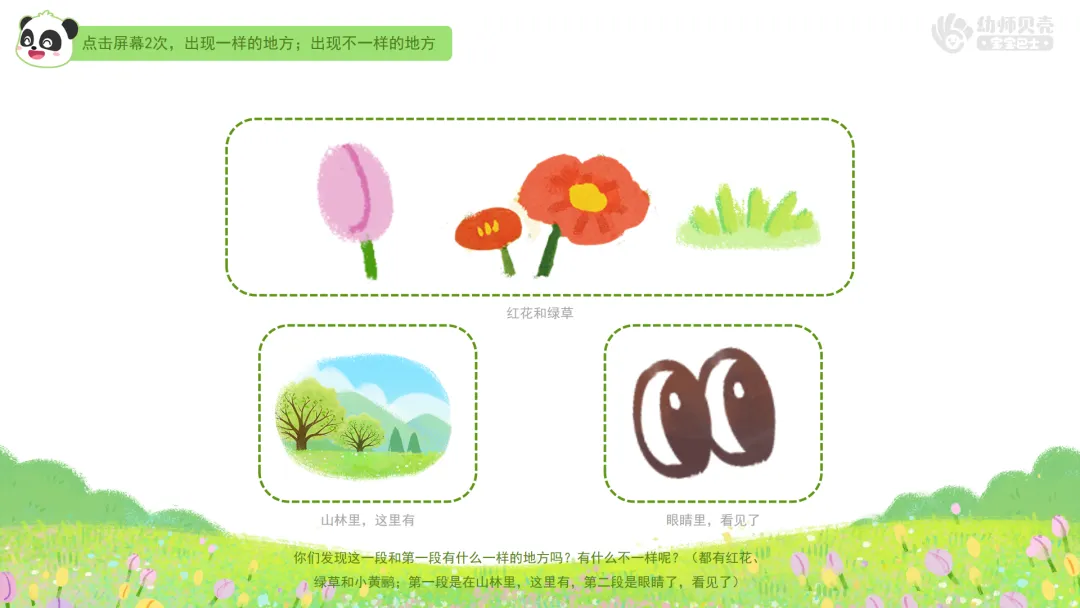 ——你们发现这一段和第一段有什么一样的地方吗?有什么不一样呢?(都有红花、绿草和小黄鹂;第一段是在山林里,这里有,第二段是眼睛了,看见了)