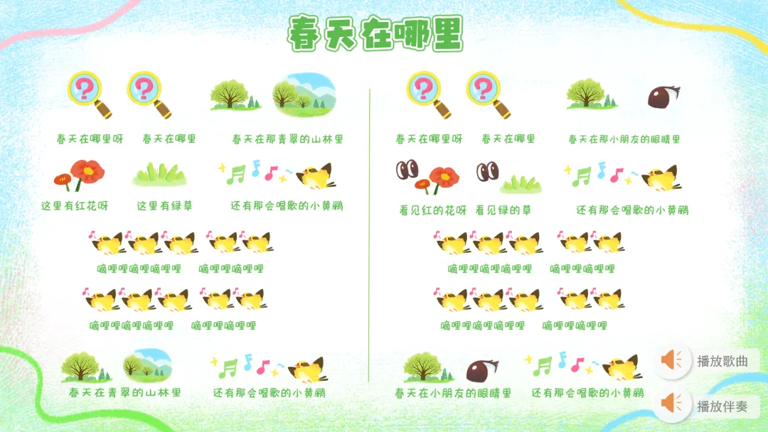 ——接下来,又去哪里找春天了?歌曲里是怎么问怎么说的?(春天在哪里呀,春天在哪里;春天在那小朋友的眼睛里)