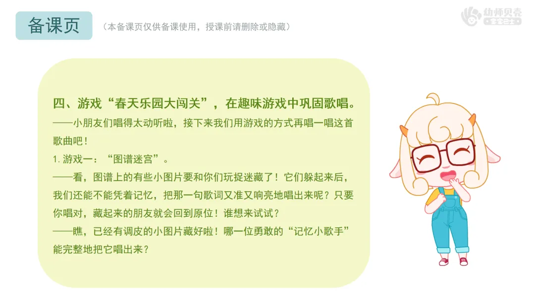 四、游戏“春天乐园大闯关”,在趣味游戏中巩固歌唱。