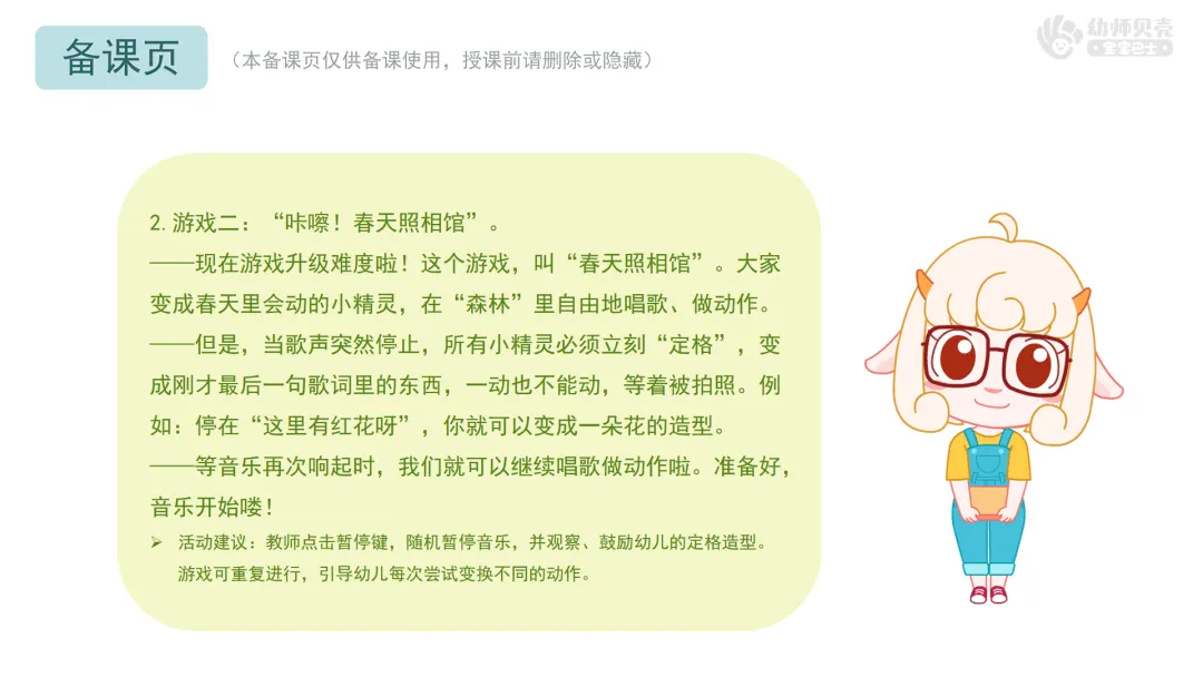 ——现在游戏升级难度啦!这个游戏,叫“春天照相馆”。大家变成春天里会动的小精灵,在“森林”里自由地唱歌、做动作。