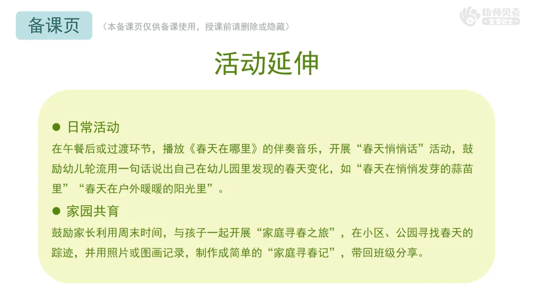 鼓励家长利用周末时间,与孩子一起开展“家庭寻春之旅”,在小区、公园寻找春天的踪迹,并用照片或图画记录,制作成简单的“家庭寻春记”,带回班级分享。