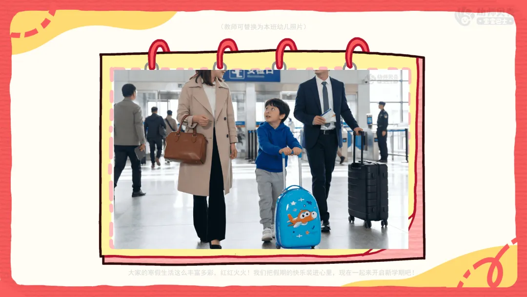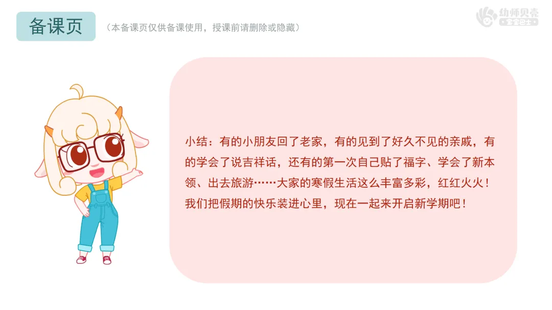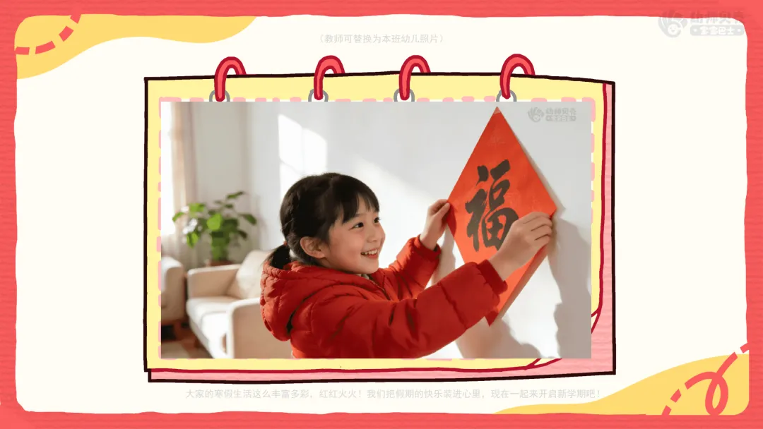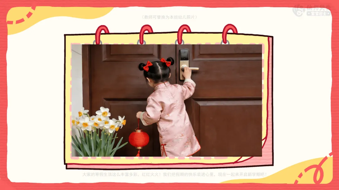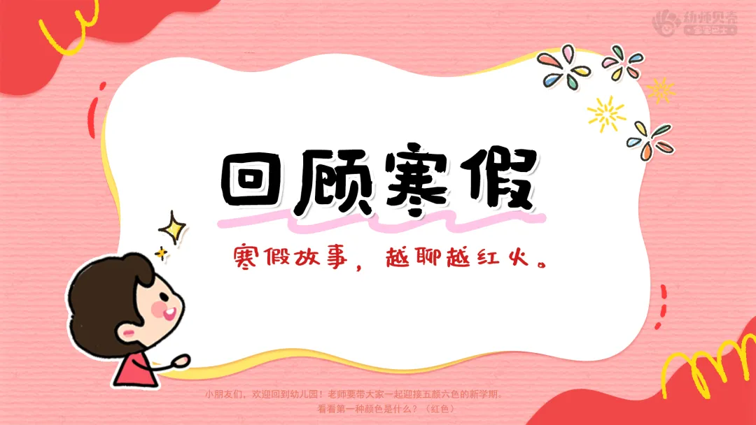 小结:有的小朋友回了老家,有的见到了好久不见的亲戚,有的学会了说吉祥话,还有的第一次自己贴了福字、学会了新本领、出去旅游……大家的寒假生活这么丰富多彩,红红火火!我们把假期的快乐装进心里,现在一起来开启新学期吧!