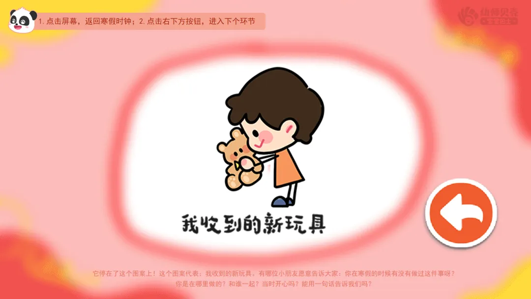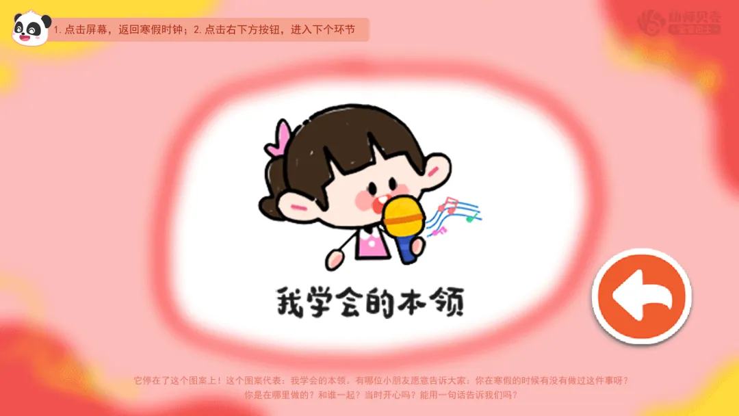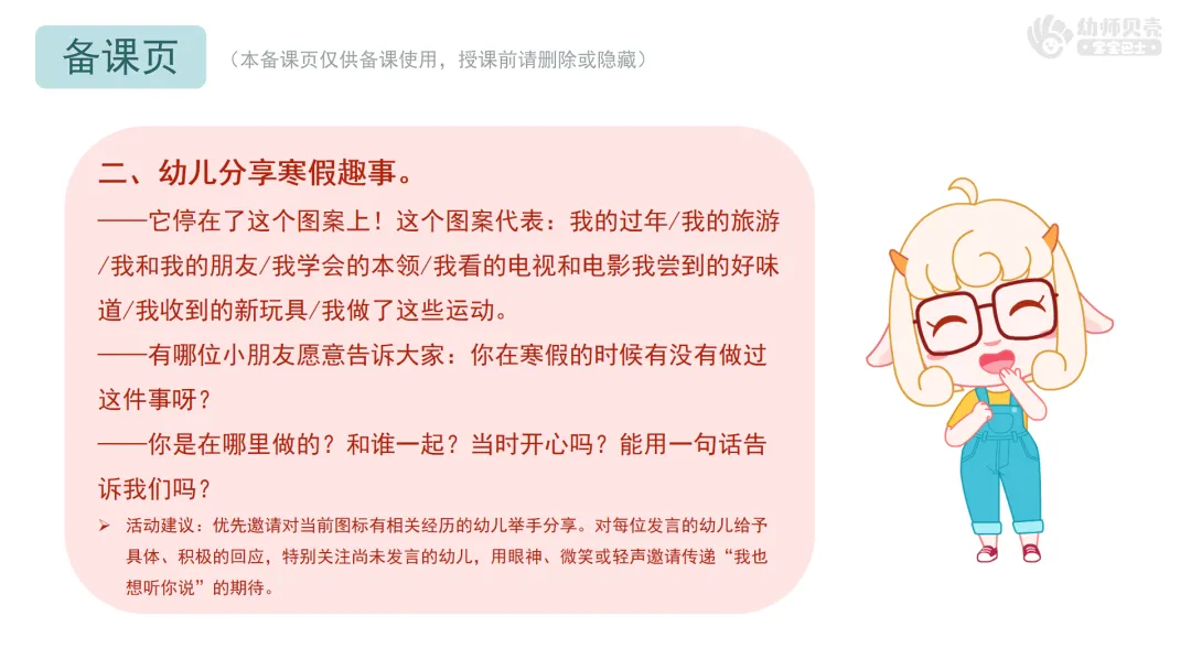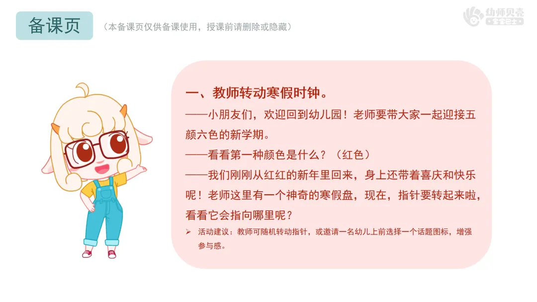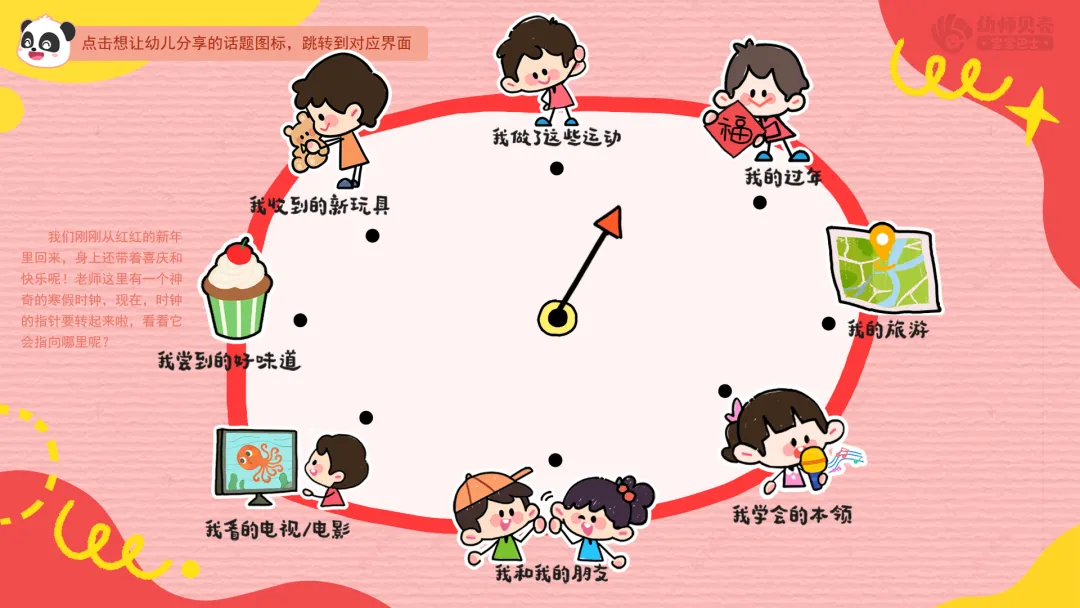 l活动要点:通过转动“寒假时钟”这种趣味互动方式,引导幼儿用简单语言分享寒假经历。
