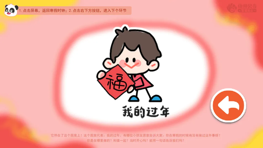 ——我们刚刚从红红的新年里回来,身上还带着喜庆和快乐呢!老师这里有一个神奇的寒假时钟,现在,时钟的指针要转起来啦,看看它会指向哪里呢?