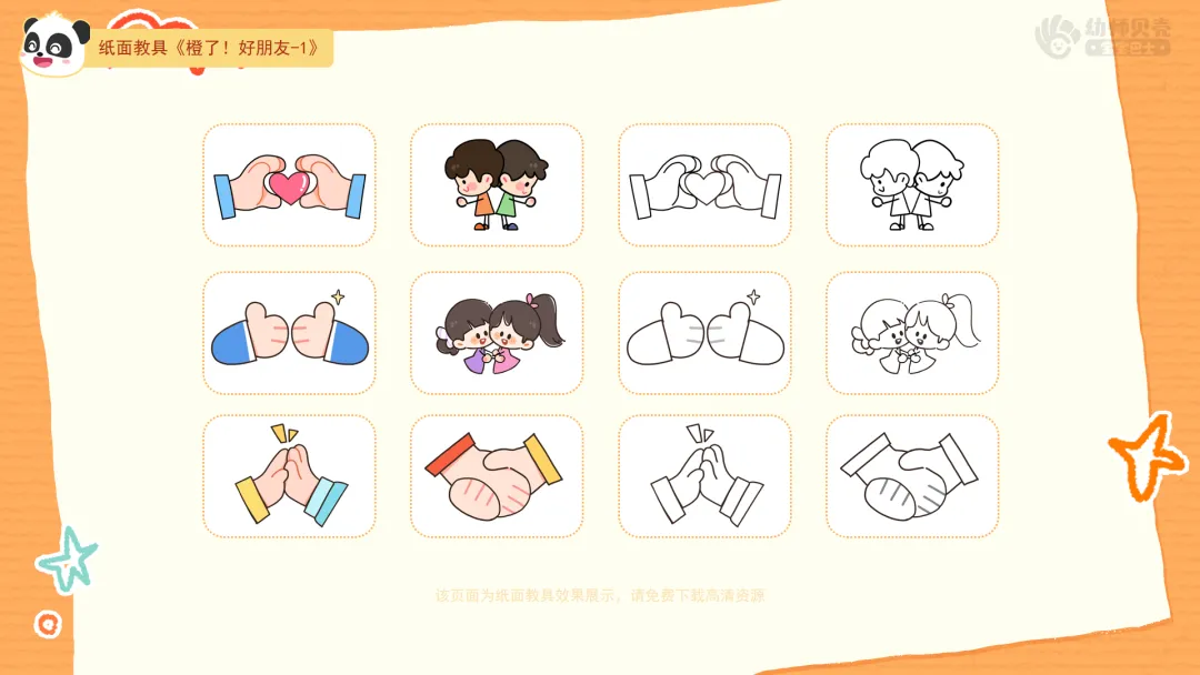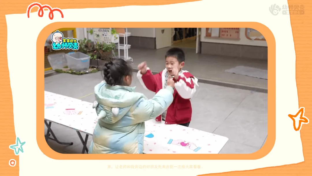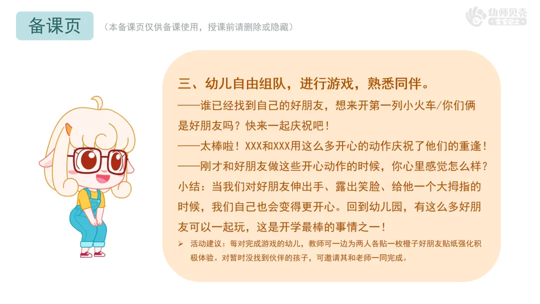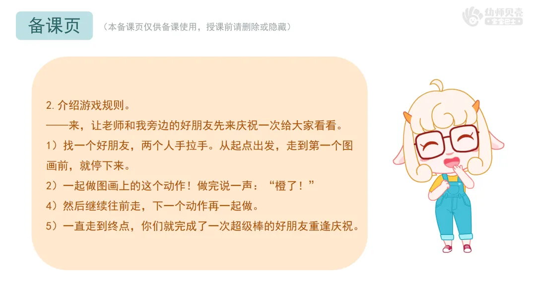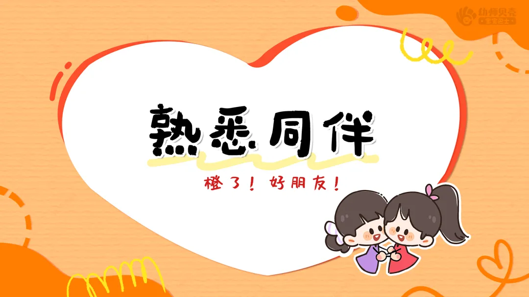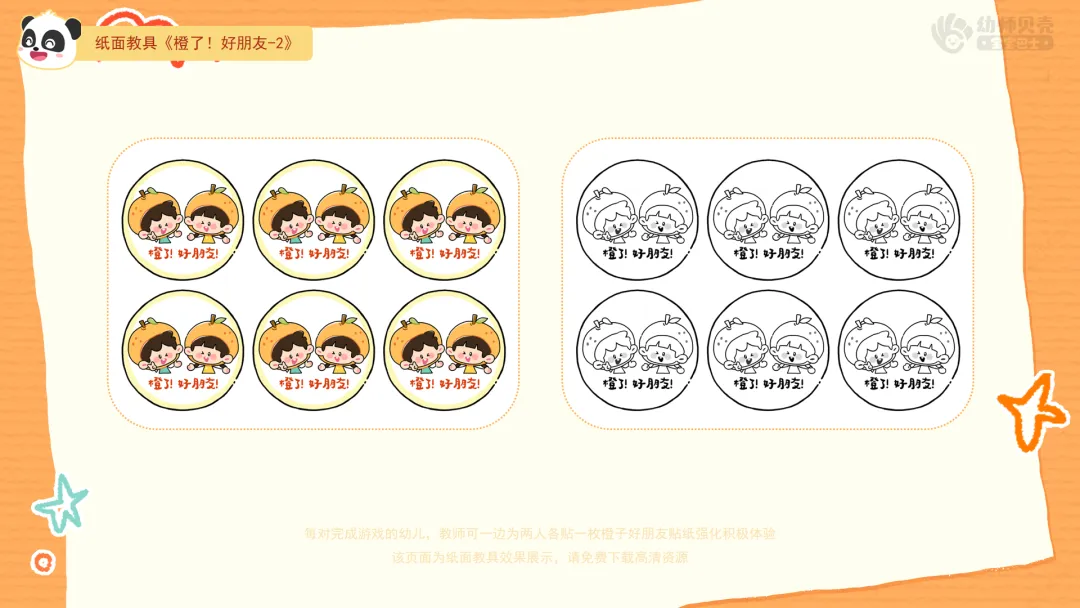 Ø活动建议:每对完成游戏的幼儿,教师可一边为两人各贴一枚橙子好朋友贴纸强化积极体验。对暂时没找到伙伴的孩子,可邀请其和老师一同完成。