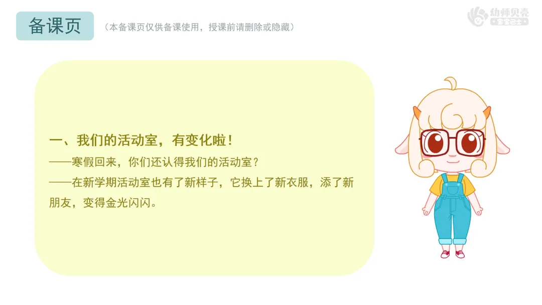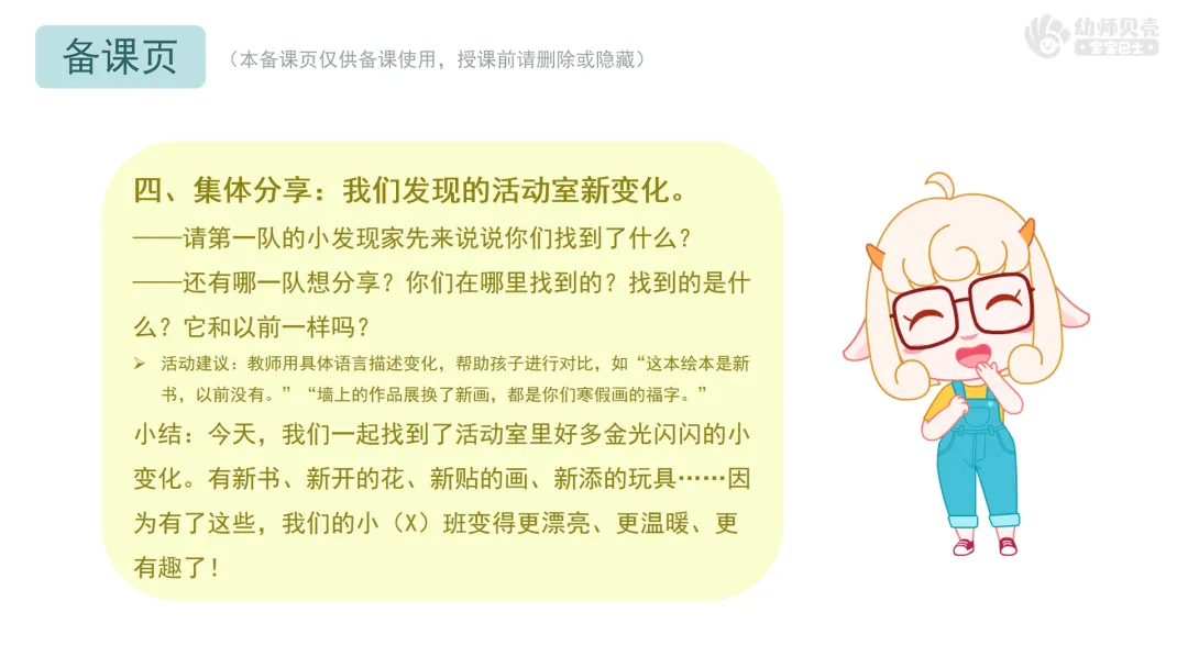 小结:今天,我们一起找到了活动室里好多金光闪闪的小变化。有新书、新开的花、新贴的画、新添的玩具……因为有了这些,我们的小(X)班变得更漂亮、更温暖、更有趣了!