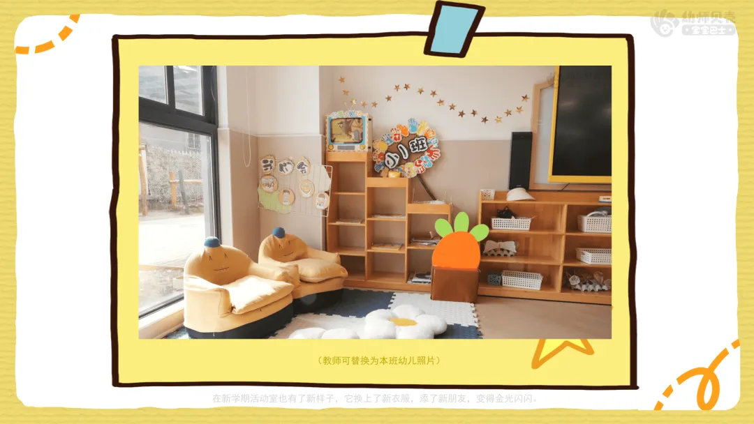 ——在新学期活动室也有了新样子,它换上了新衣服,添了新朋友,变得金光闪闪。