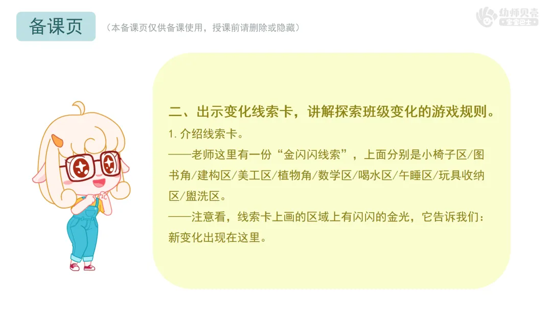 二、出示变化线索卡,讲解探索班级变化的游戏规则。