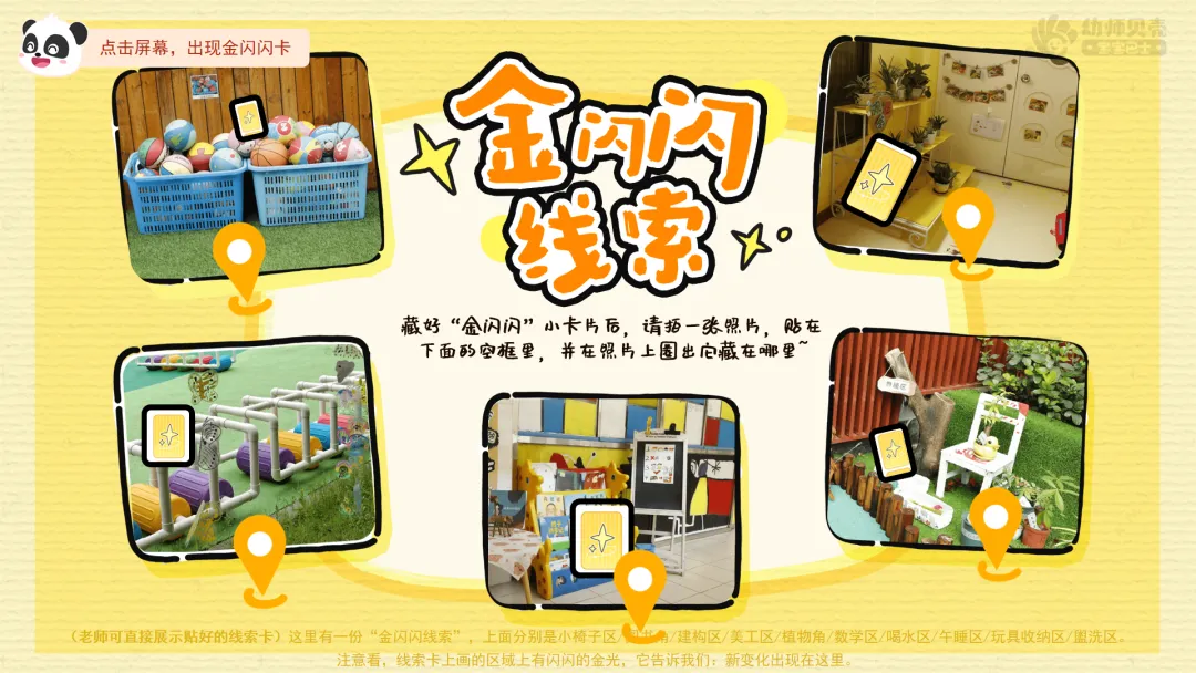 ——老师这里有一份“金闪闪线索”,上画的分别是小椅子区/图书角/建构区/美工区