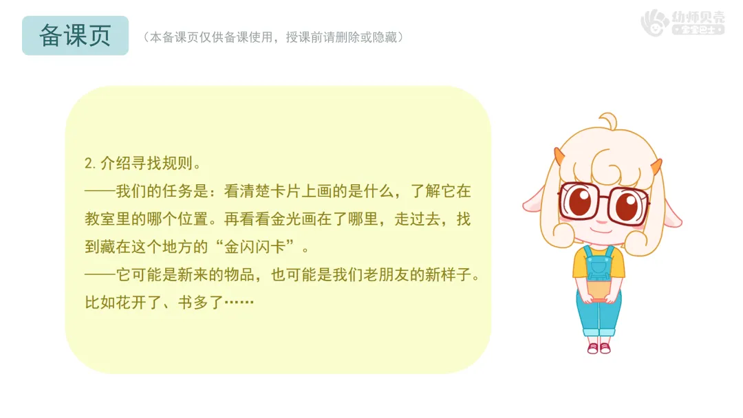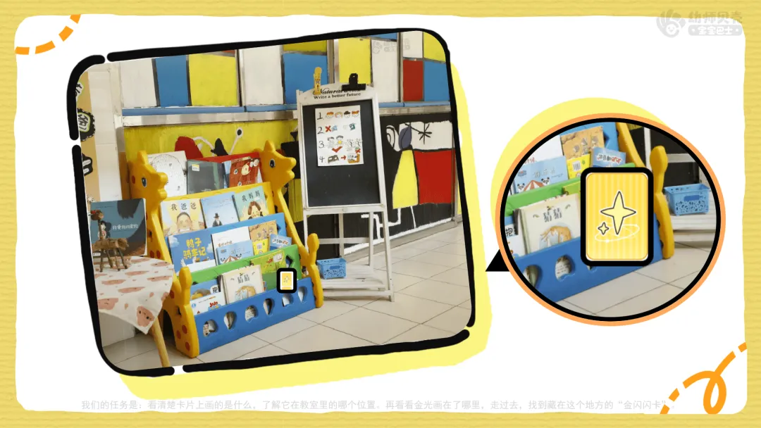 ——我们的任务是:看清楚卡片上画的是什么,了解它在教室里的哪个位置。再看看金光画在了哪里,走过去,找到藏在这个地方的“金闪闪卡”。