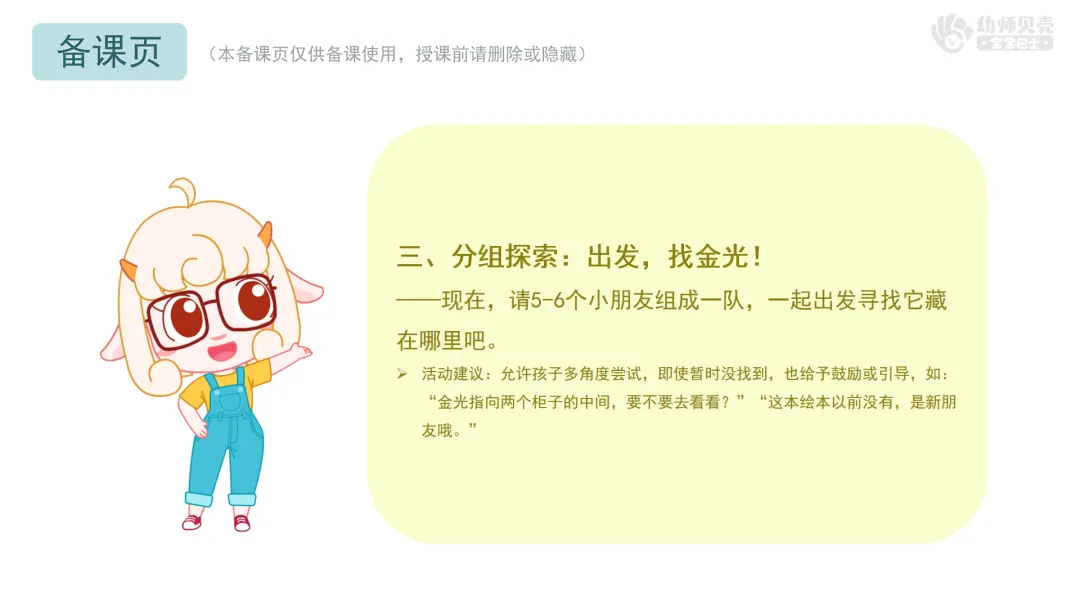 Ø活动建议:允许孩子多角度尝试,即使暂时没找到,也给予鼓励或引导,如:“金光指向两个柜子的中间,要不要去看看?”“这本绘本以前没有,是新朋友哦。”