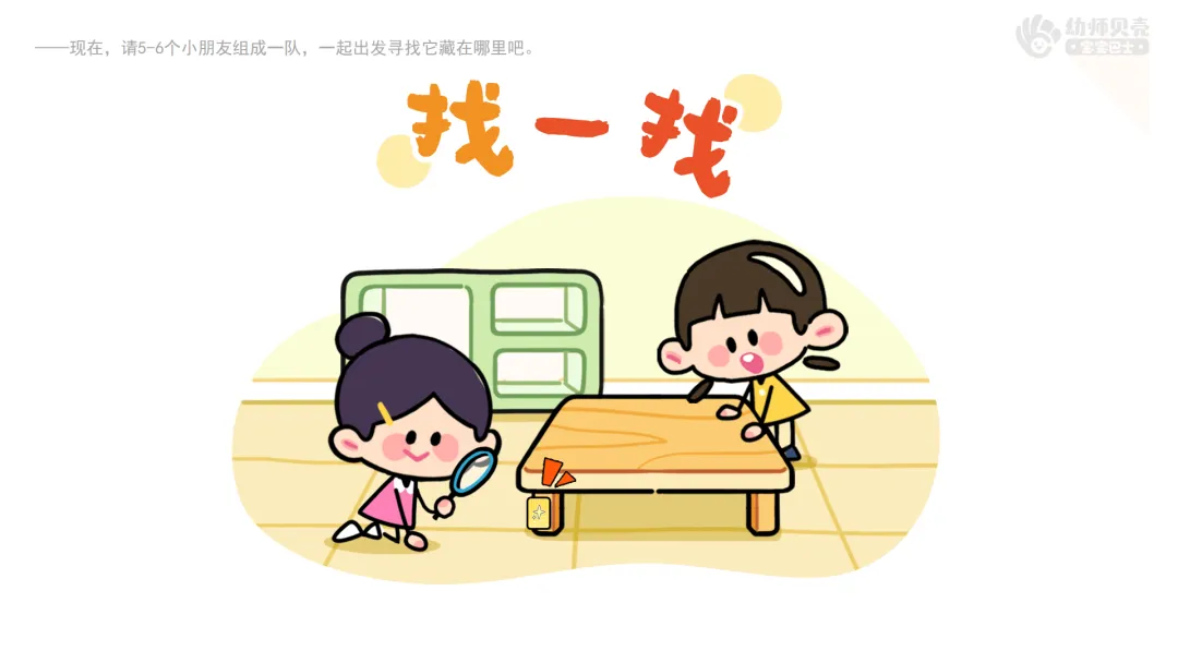 ——现在,请5-6个小朋友组成一队,一起出发寻找它藏在哪里吧。