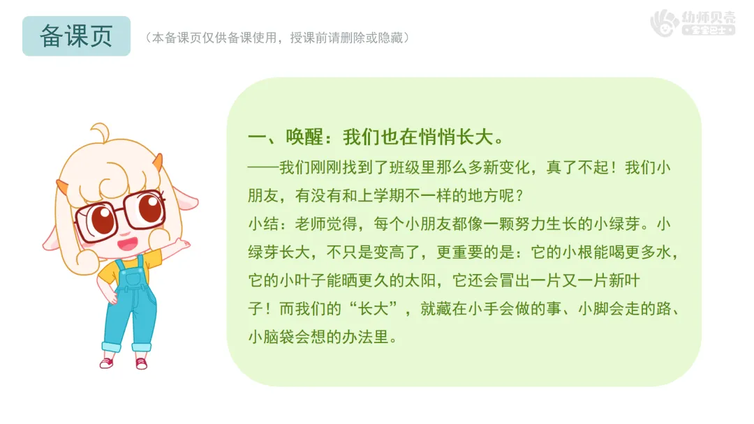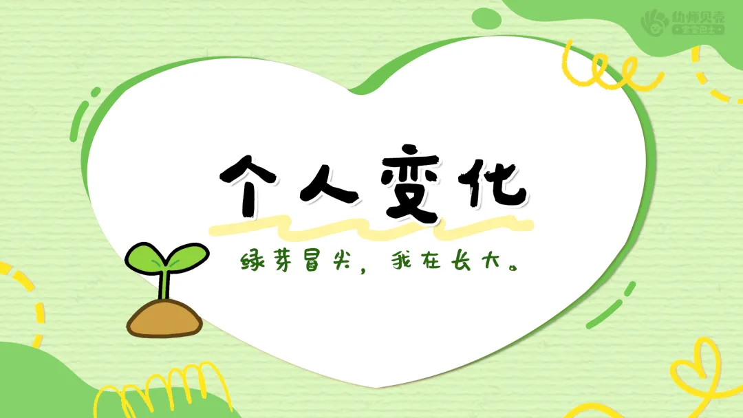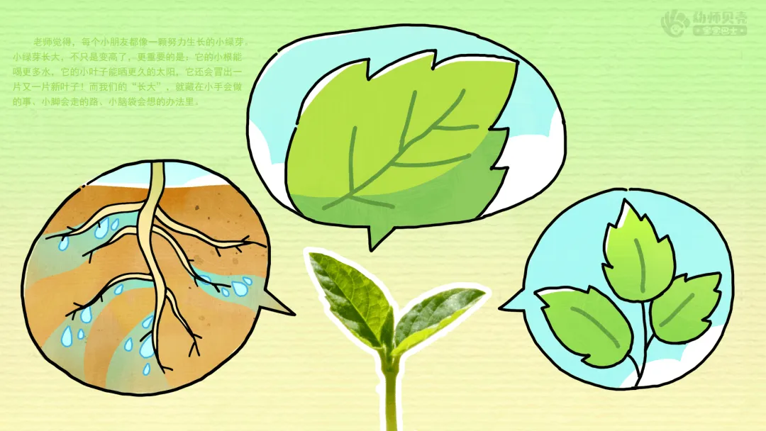 小结:老师觉得,每个小朋友都像一颗努力生长的小绿芽。小绿芽长大,不只是变高了,更重要的是:它的小根能喝更多水,它的小叶子能晒更久的太阳,它还会冒出一片又一片新叶