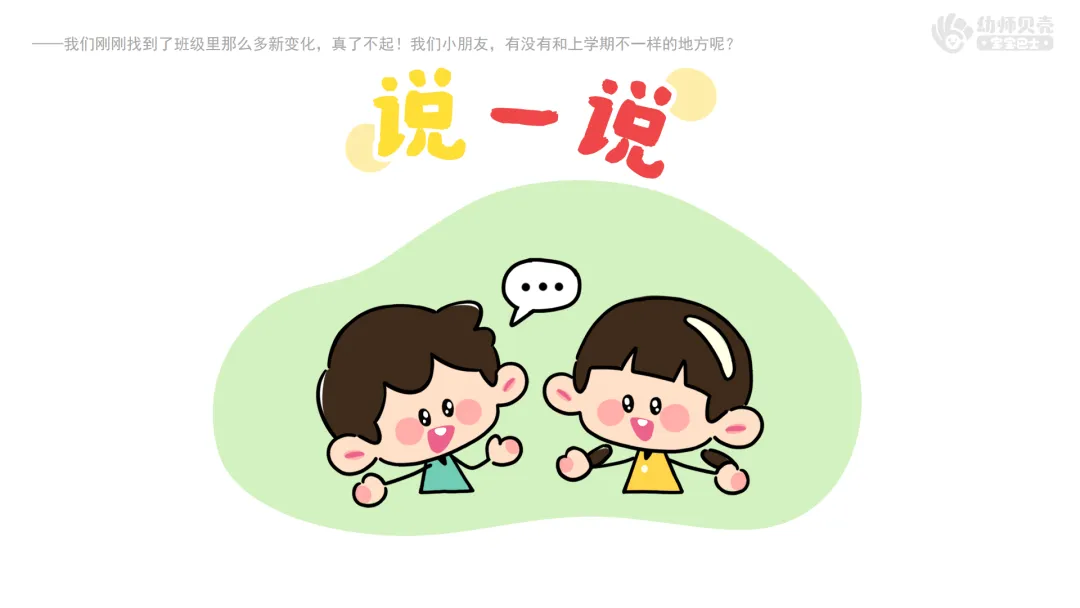 ——我们刚刚找到了班级里那么多新变化,真了不起!我们小朋友,有没有和上学期不一样的地方呢?