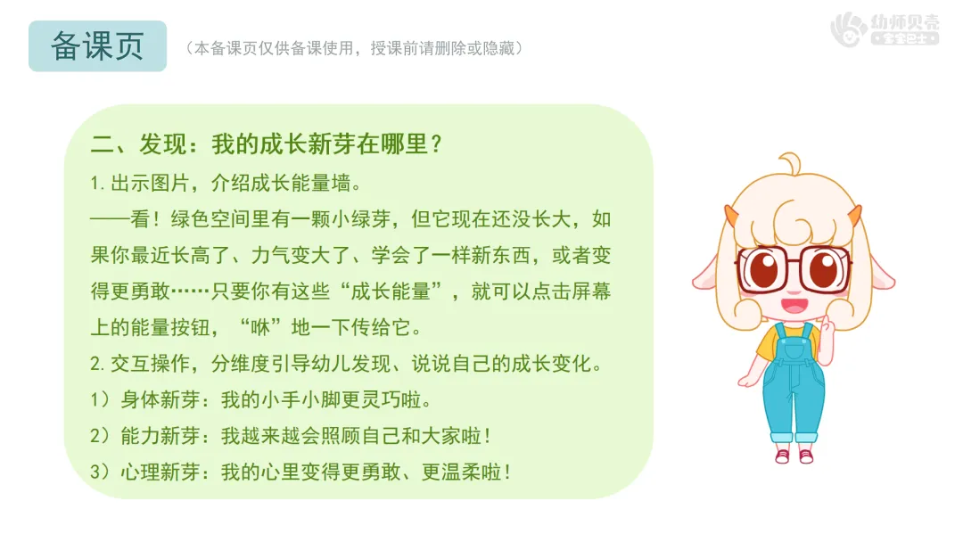 l活动要点:感知并表达自己在生活自理、集体适应等方面的进步,从积极的角度肯定自我。