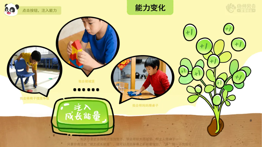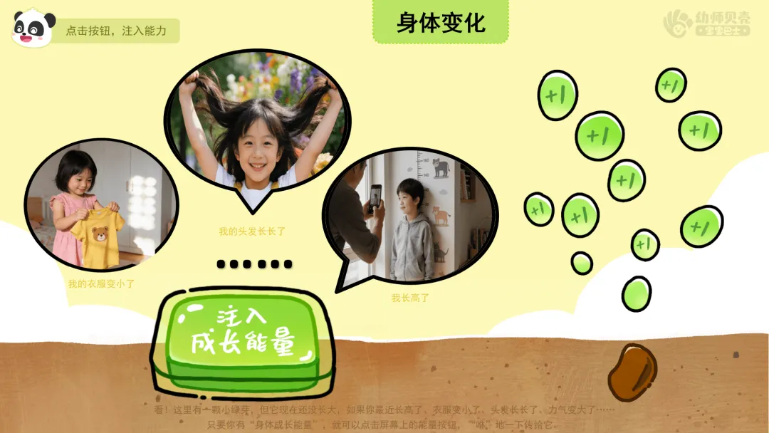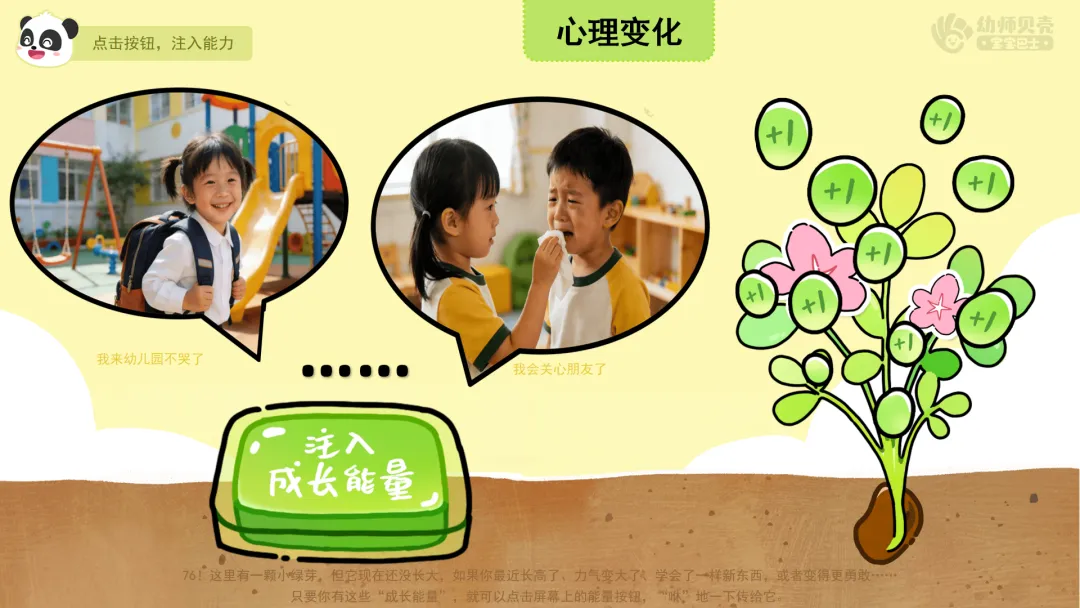 ——看!绿色空间里有一颗小绿芽,但它现在还没长大,如果你最近长高了、力气变大了、学会了一样新东西,或者变得更勇敢……只要你有这些“成长能量”,就可以点击屏幕上的能量按钮,“咻”地一下传给它。