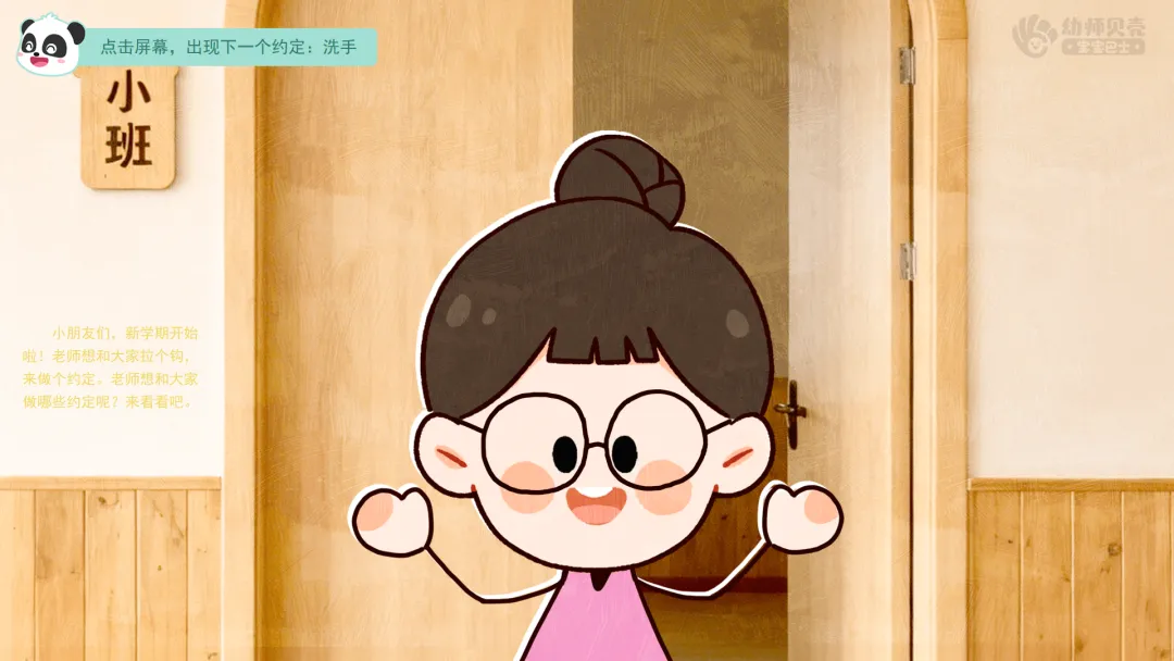 ——青色空间里有许多约定。小朋友们,新学期开始啦!老师想和大家拉个钩,来做个约定。