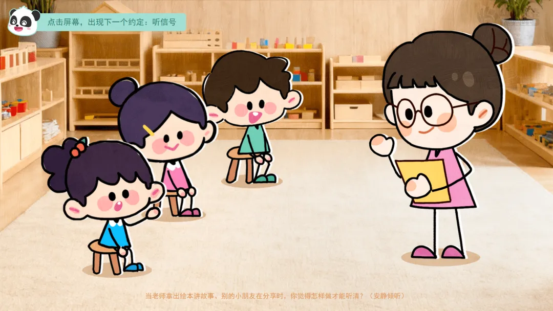 ——当老师拿出绘本讲故事、别的小朋友在分享时,你觉得怎样做才能听清?(安静倾听)