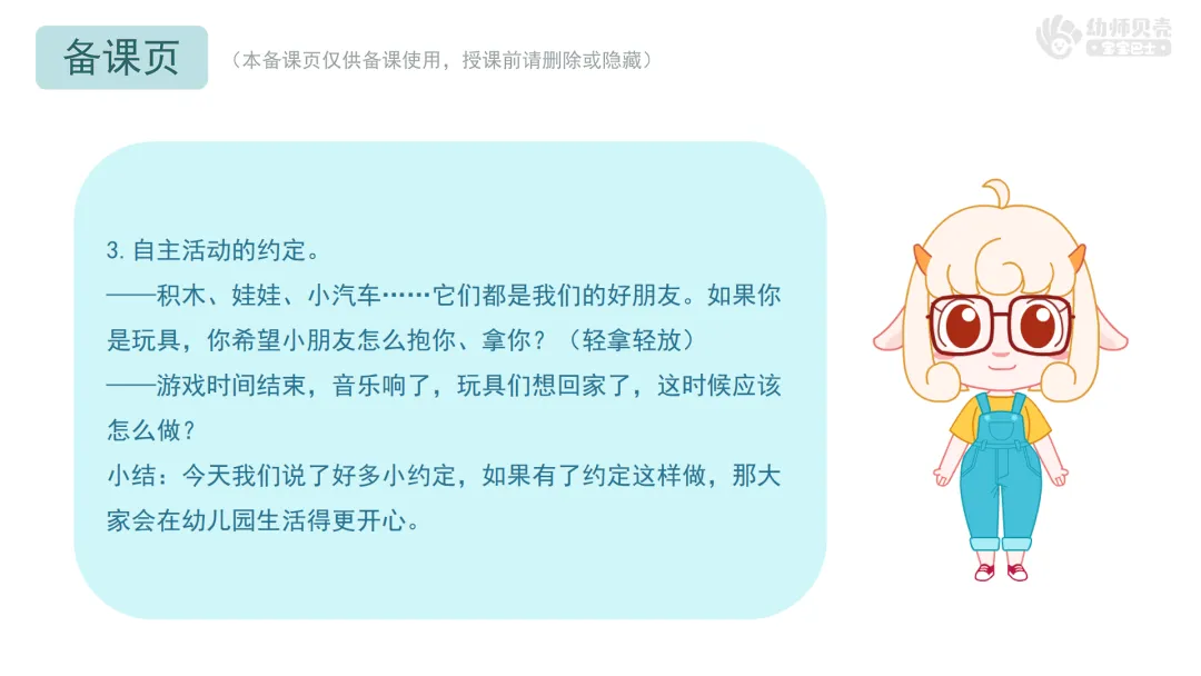 小结:今天我们说了好多小约定,如果有了约定这样做,那大家会在幼儿园生活得更开心。